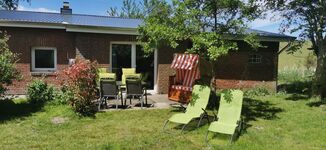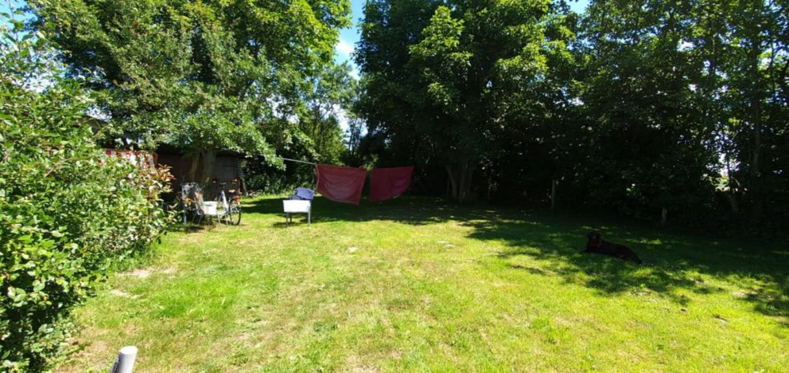 Das Grundstück des Ferienhauses ist etwa 1.600 qm groß und hinter dem Haus befindet sich eine großzügige Wiese mit Bäumen und einem Maulwurf.