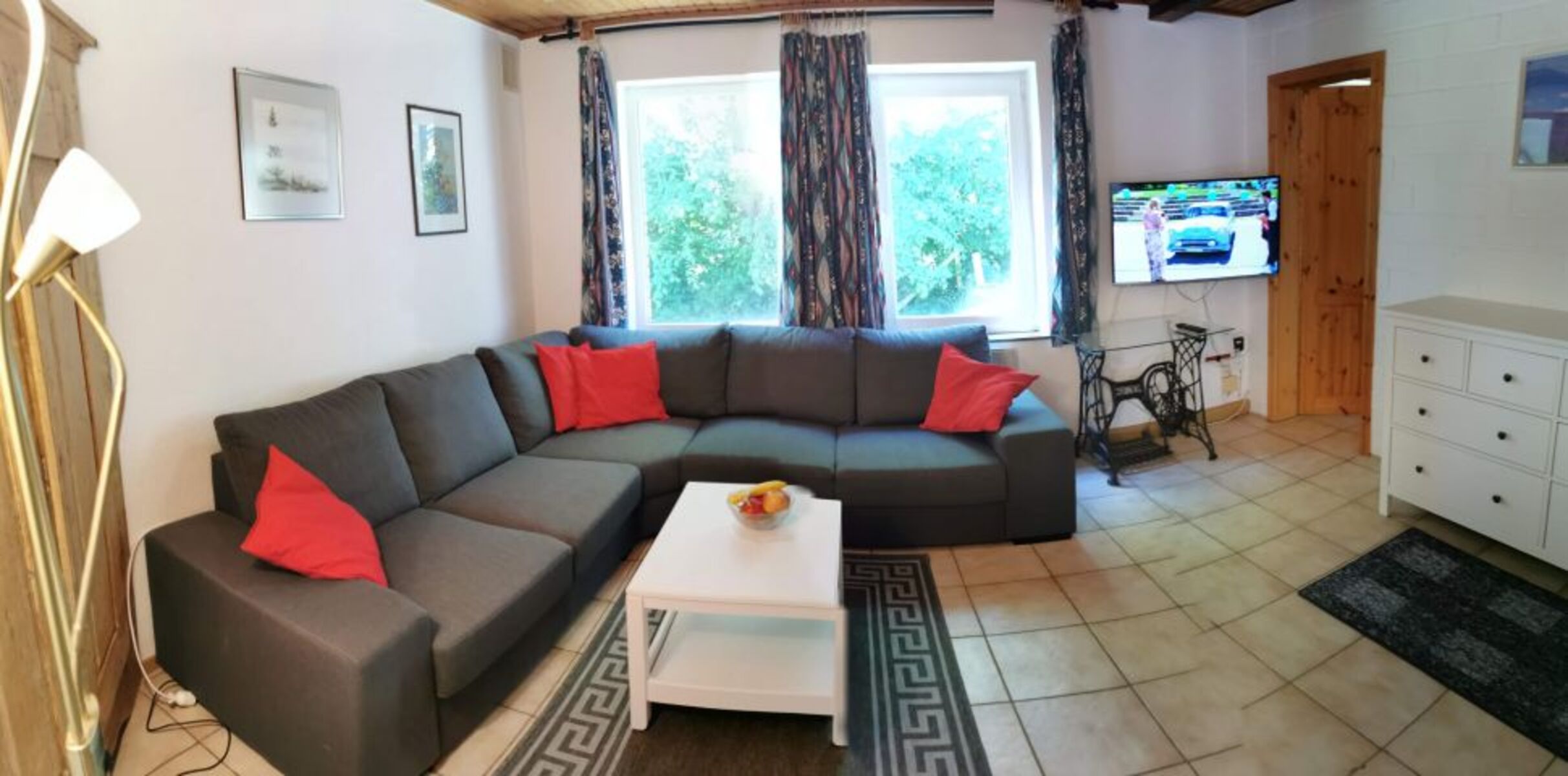 - offen verbundenes Wohnzimmer (mit Radio und LED-Fernseher),