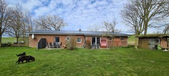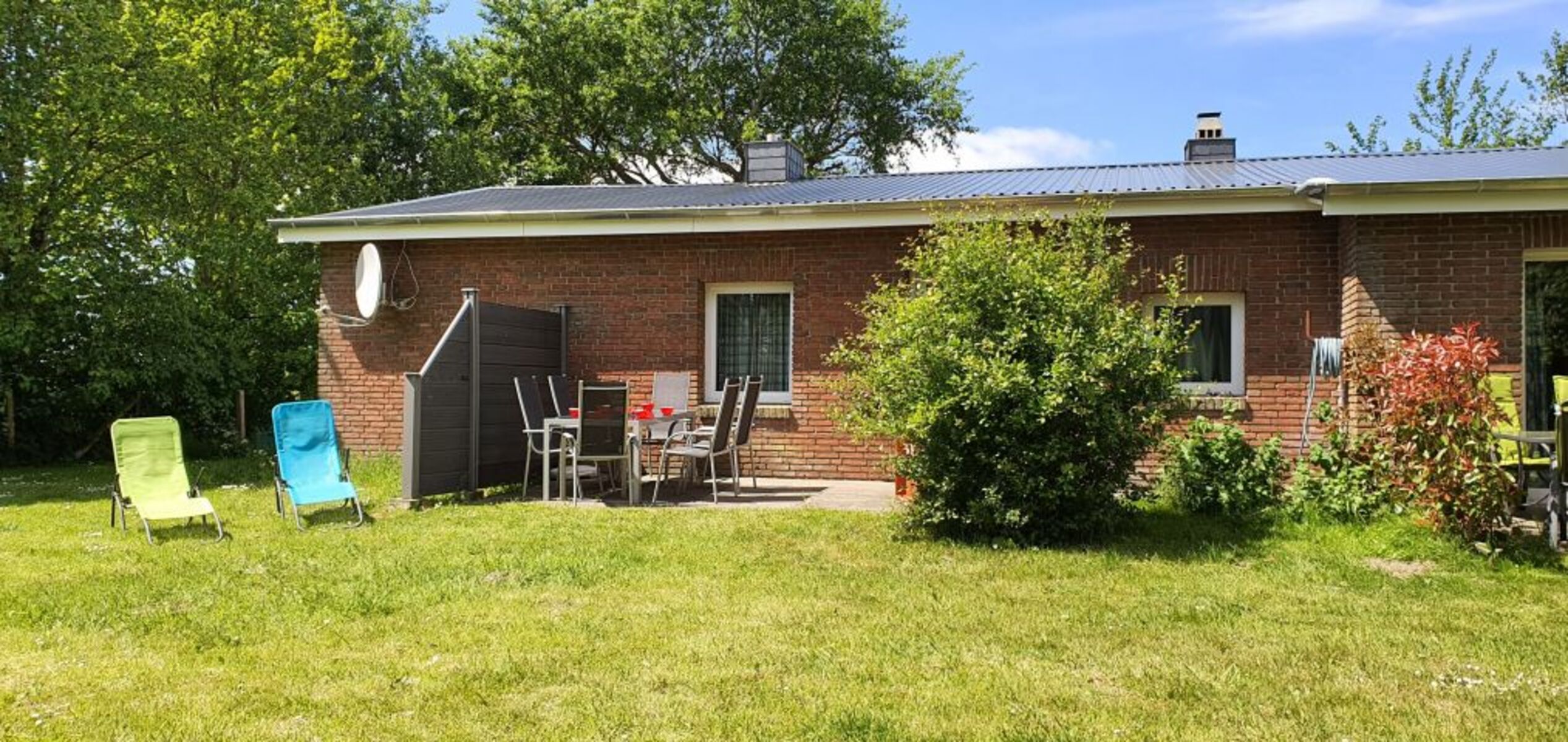 Das Grundstück des Ferienhauses ist etwa 1.600 qm groß und hinter dem Haus befindet sich eine großzügige Wiese mit Bäumen und einem Maulwurf. Die Umgebung ist von altem Baumbestand umgeben und bietet somit eine angenehme Atmosphäre.