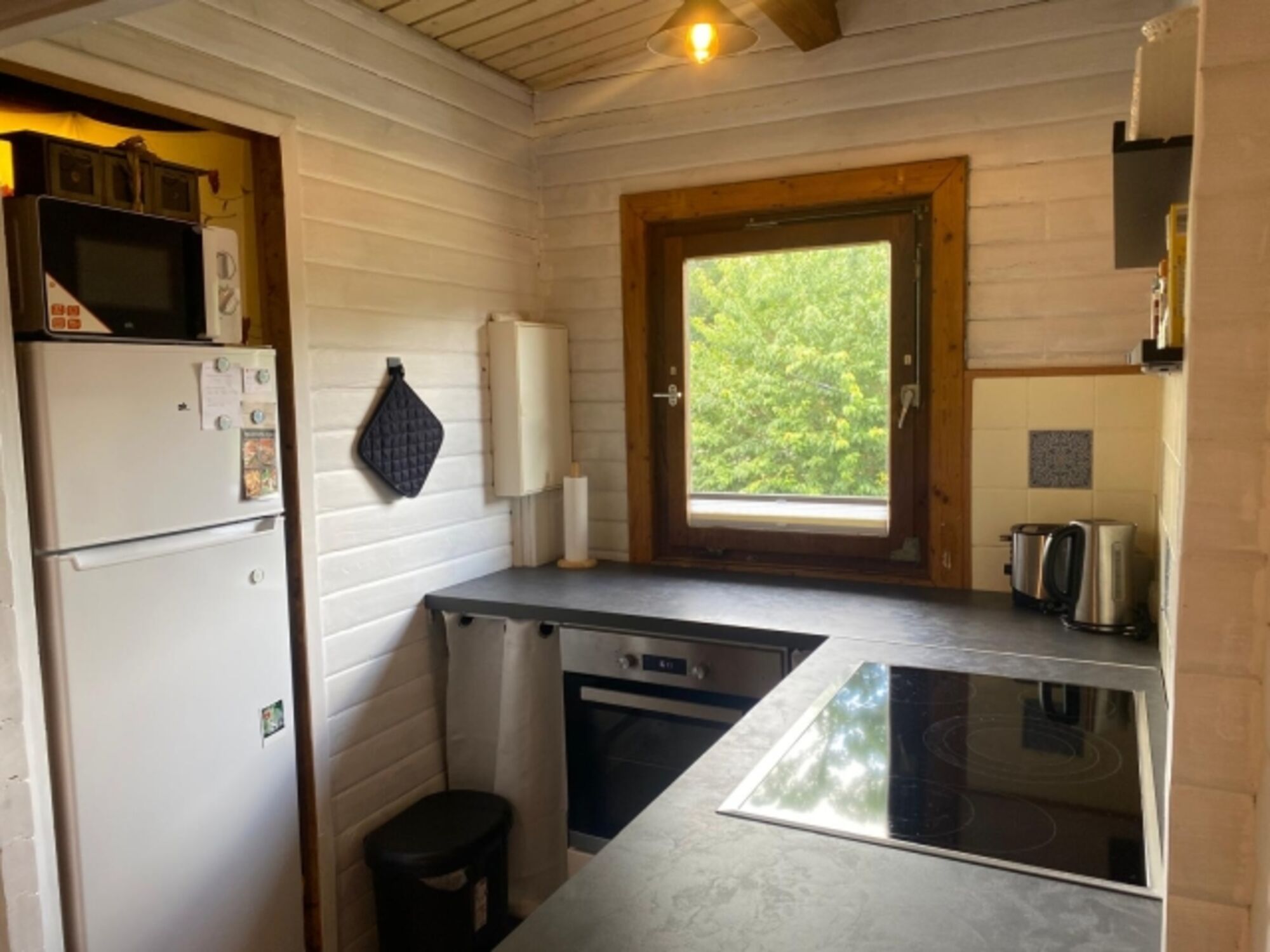 Die Küche bietet einen 4-Platten Elektroherd, einen Backofen, eine Geschirrspülmaschine, eine Mikrowelle, einen großen Kühlschrank und weitere Küchengeräte, wie Toaster, Wasserkocher, Kaffeemaschine etc. sowie eine komplette Geschirr- und Kochausstattung für mindestens 6 Personen.