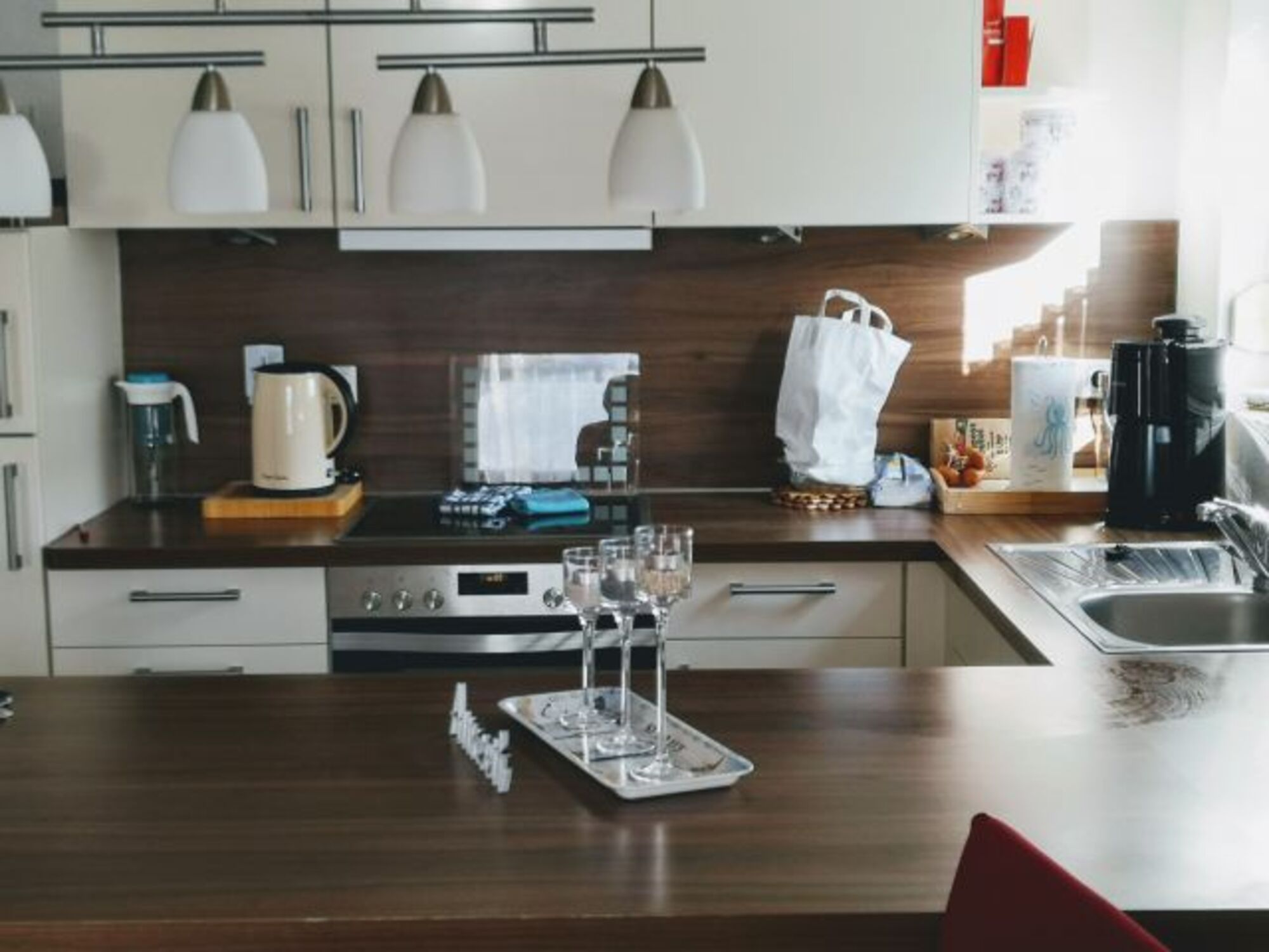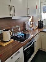 4-Platten Herd, Cerankochfeld, Dunstabzugshaube, Kühlschrank mit Gefrierfach, Senseo-Kaffeeautomat, Eierkocher, Mixer, Korkenzieher / Flaschenöffner, Gewürze (Salz, Pfeffer, Zucker), Geschirrhandtücher, Mülltüten, Essplatz in der Küche