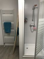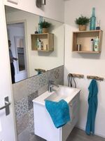 Das großzügige Badezimmer wurde komplett renoviert und ist mit einer Dusche, Waschbecken mit Unterschrank, einem großen Spiegel, Handtuchheizkörper ausgestattet. Auch ein Föhn ist vorhanden. Neben dem Badezimmer befindet sich ein Abstellraum mit Waschmaschine und Wäschetrockner. Wäscheständer sind in verschiedenen Ausführungen vorhanden.