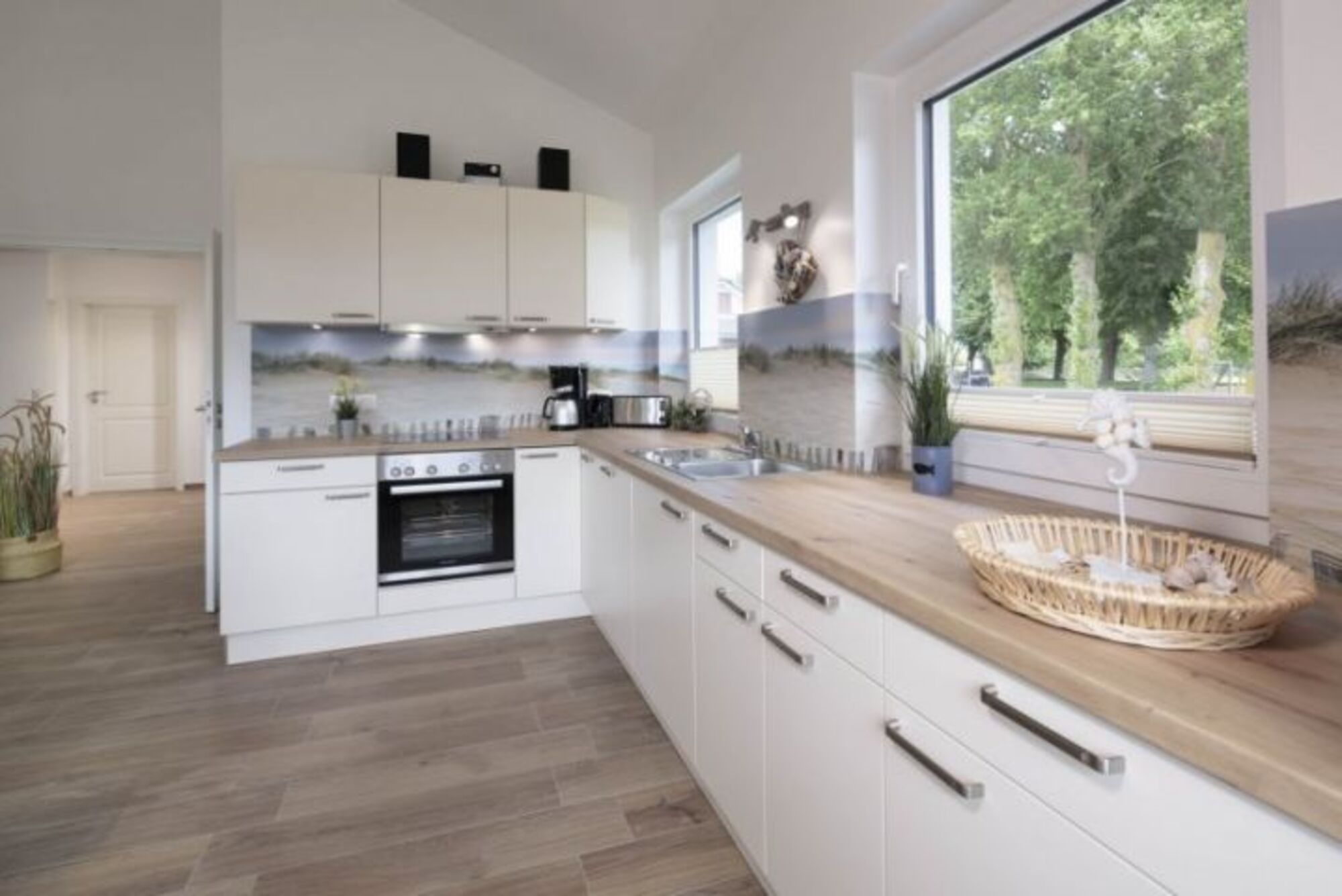 Cerankochfeld, Dunstabzugshaube, Gefrierschrank, Korkenzieher / Flaschenöffner, Geschirrhandtücher, Mülltüten, Essplatz in der Küche