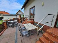 Über eine Treppe gelangen Sie ins 1. Obergeschoss, wo ein einladendes Wohnzimmer mit einer bequemen Couch, die auch als Schlafgelegenheit für zwei weitere Personen dient, auf Sie wartet. Außerdem gibt es ein separates Schlafzimmer mit einem komfortablen Doppelbett und Kleiderschrank. Genießen Sie die frische Luft auf der möblierten Terrasse direkt am Eingang, die perfekt ist um bei schönem Wetter Ihr Frühstück zu genießen oder den Abend mit einem Glas Wein ausklingen zu lassen. Ein Pkw-Stellplatz direkt am Haus sowie kostenfreies W-LAN stehen Ihnen ebenfalls zur Verfügung. Falls Sie gerne grillen möchten, können Sie auf Anfrage eine Grillmöglichkeit direkt beim Vermieter ausleihen. Zudem besteht die Möglichkeit gegen eine Kaution von 50 € eine Mikrowelle zur Verfügung gestellt zu bekommen. Ein Kinderbett und ein Hochstuhl können auf Nachfrage kostenfrei geliehen werden.