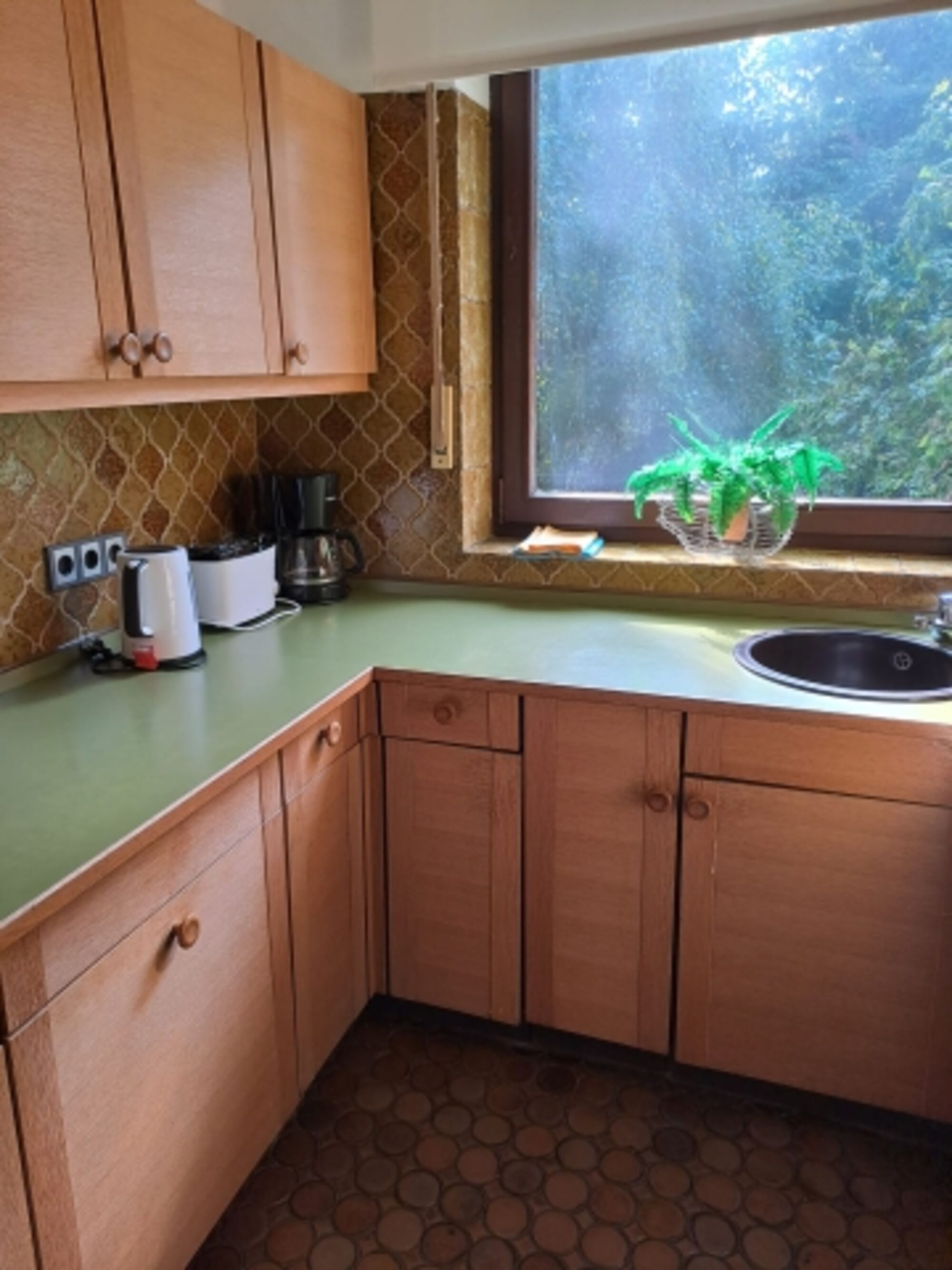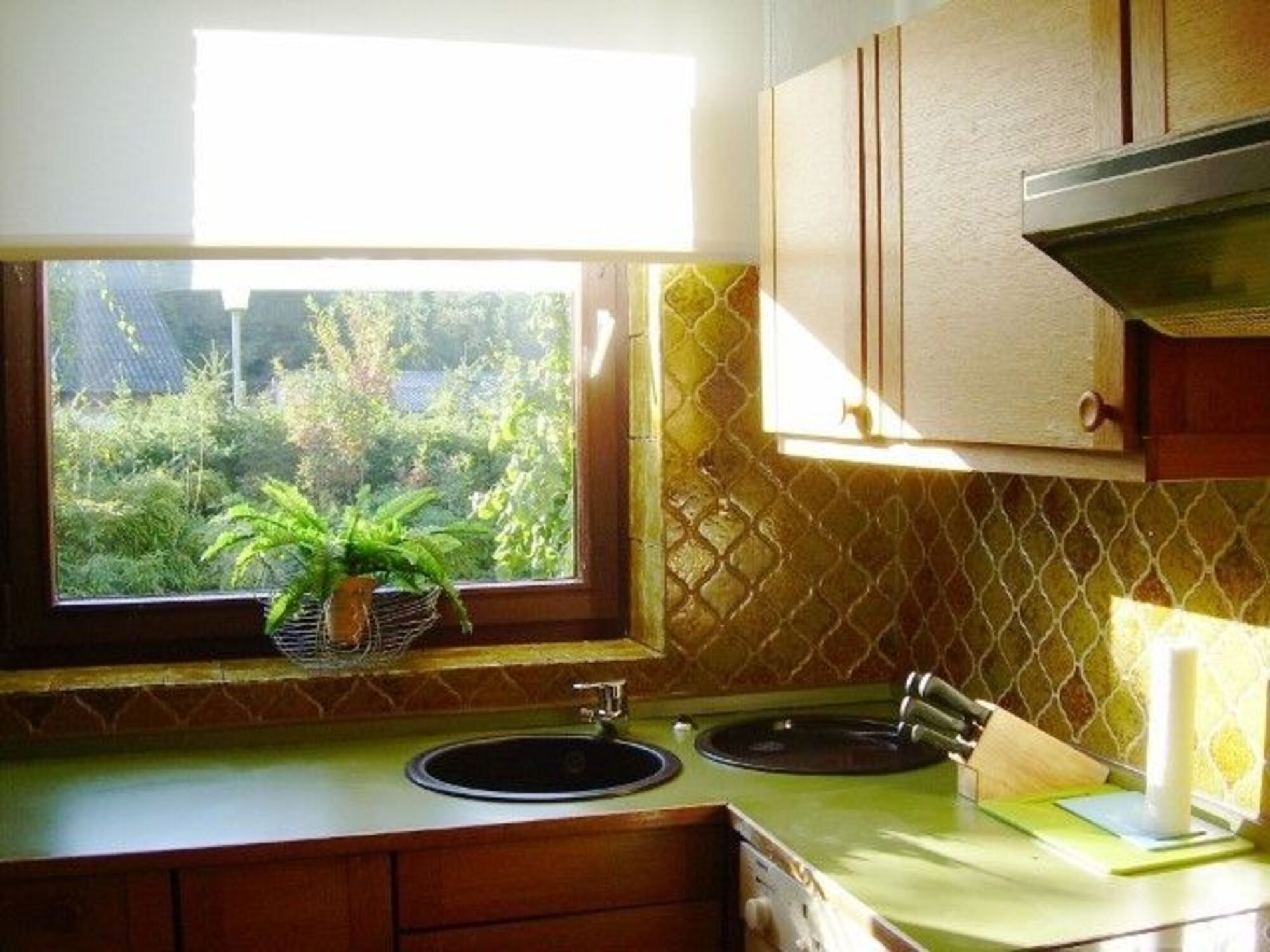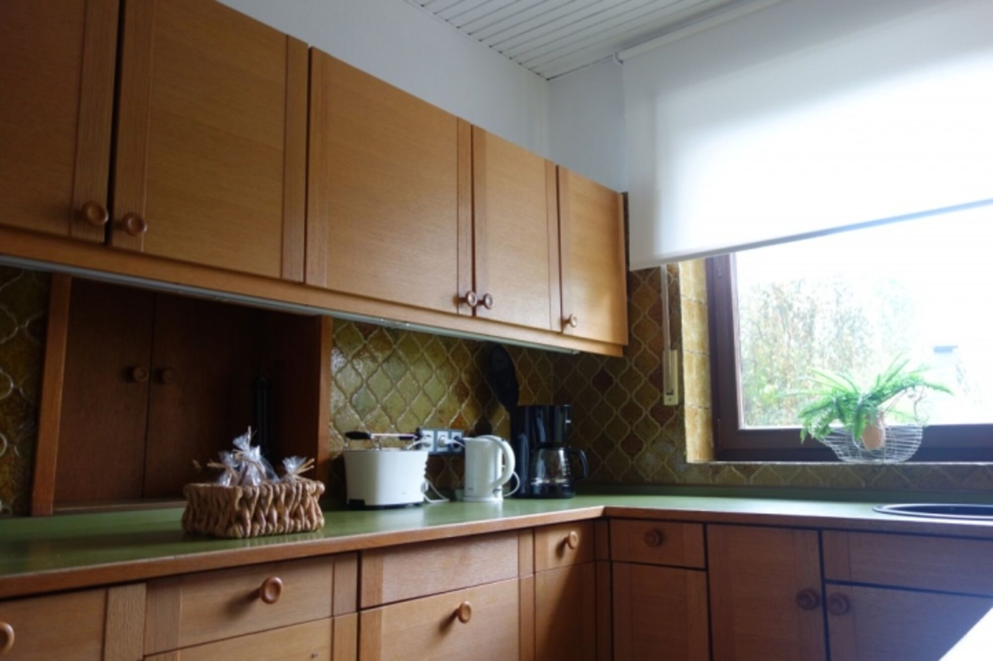 Cerankochfeld, Dunstabzugshaube, Kühlschrank mit Gefrierfach, Eierkocher, Mixer, Korkenzieher / Flaschenöffner, Geschirrhandtücher