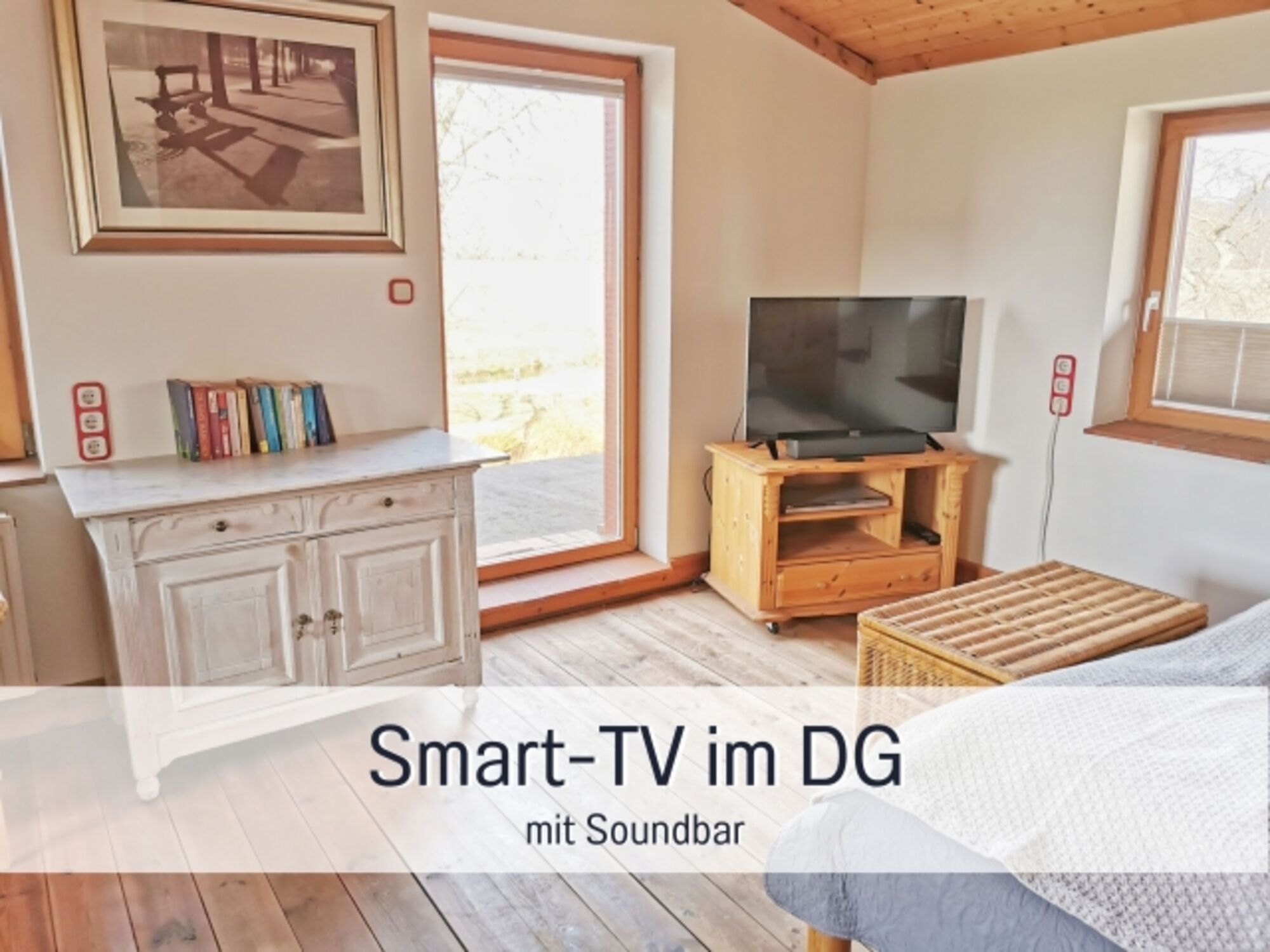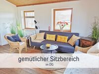 OG: Heller Wohn-Schlafraum (1 Doppelbett 180x200 cm) mit gemütlicher Sitzecke zum Fernsehen, mit Blick über Wiesen und Felder. Hier oben gibt es außerdem ein separates Schlafzimmer mit großem Kleiderschrank, Tagesbett und Schlafsessel für zwei Kinder.