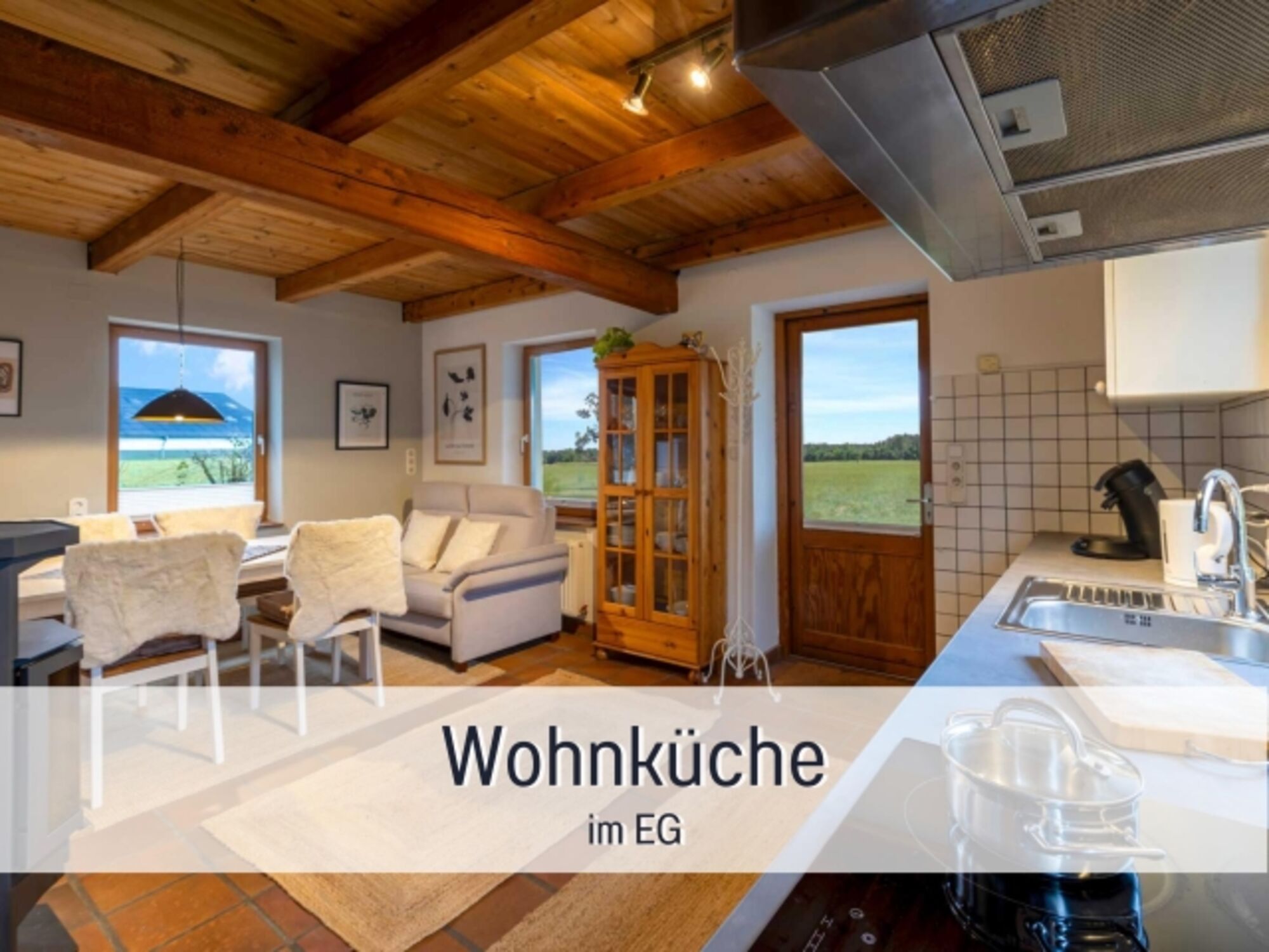 EG: Tolle neue Küche mit Essbereich, Sofa und Kaminofen sowie 1 kleines Arbeitszimmer mit Schreibtisch (Durchgangszimmer zum Bad) und Duschbad. EG ist für Rollis mit max. 69 cm Breite geeignet.