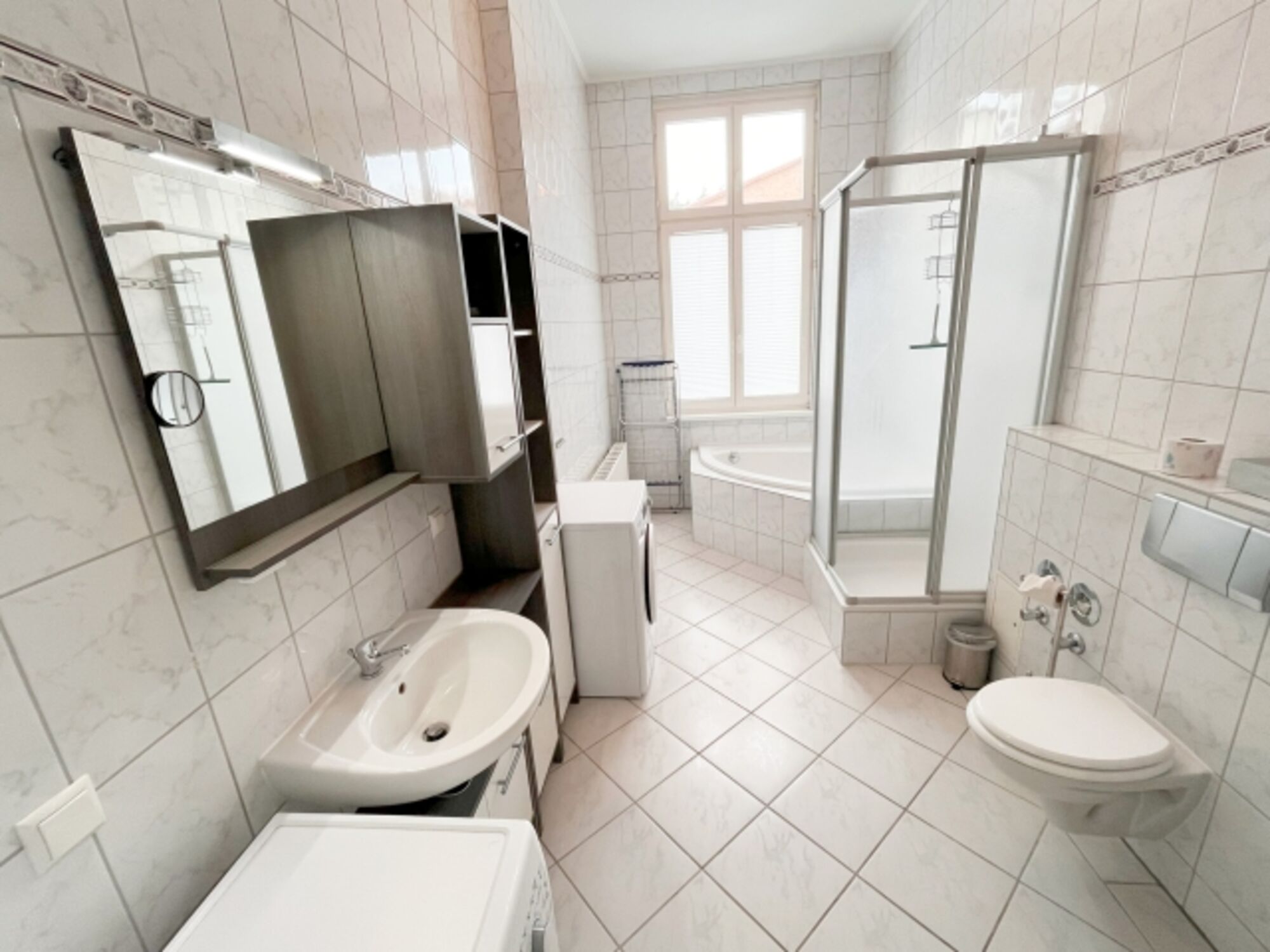 Das moderne Tageslichtbad verfügt über Dusche, Badewanne, WC, sowie Waschmaschine und Trockner - ideal auch für längere Aufenthalte.
