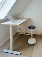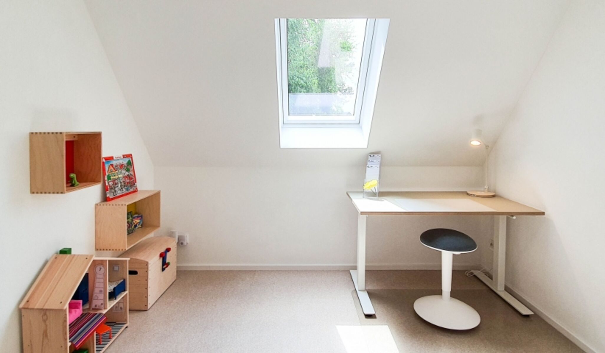 Das Dachgeschoss ist mit fußwarmen Korkboden ausgestattet. Wenn Sie ins Dachgeschoss kommen, dann treffen Sie zuerst auf eine Kinderspielecke und einen höhenverstellbaren Schreibtisch mit Ladestation für Smartphones. Das Dachgeschoss (Kinderspielecke und Schlafzimmer) darf von Hunden nicht betreten werden. Ausnahmen nur nach telefonischer Rücksprache.