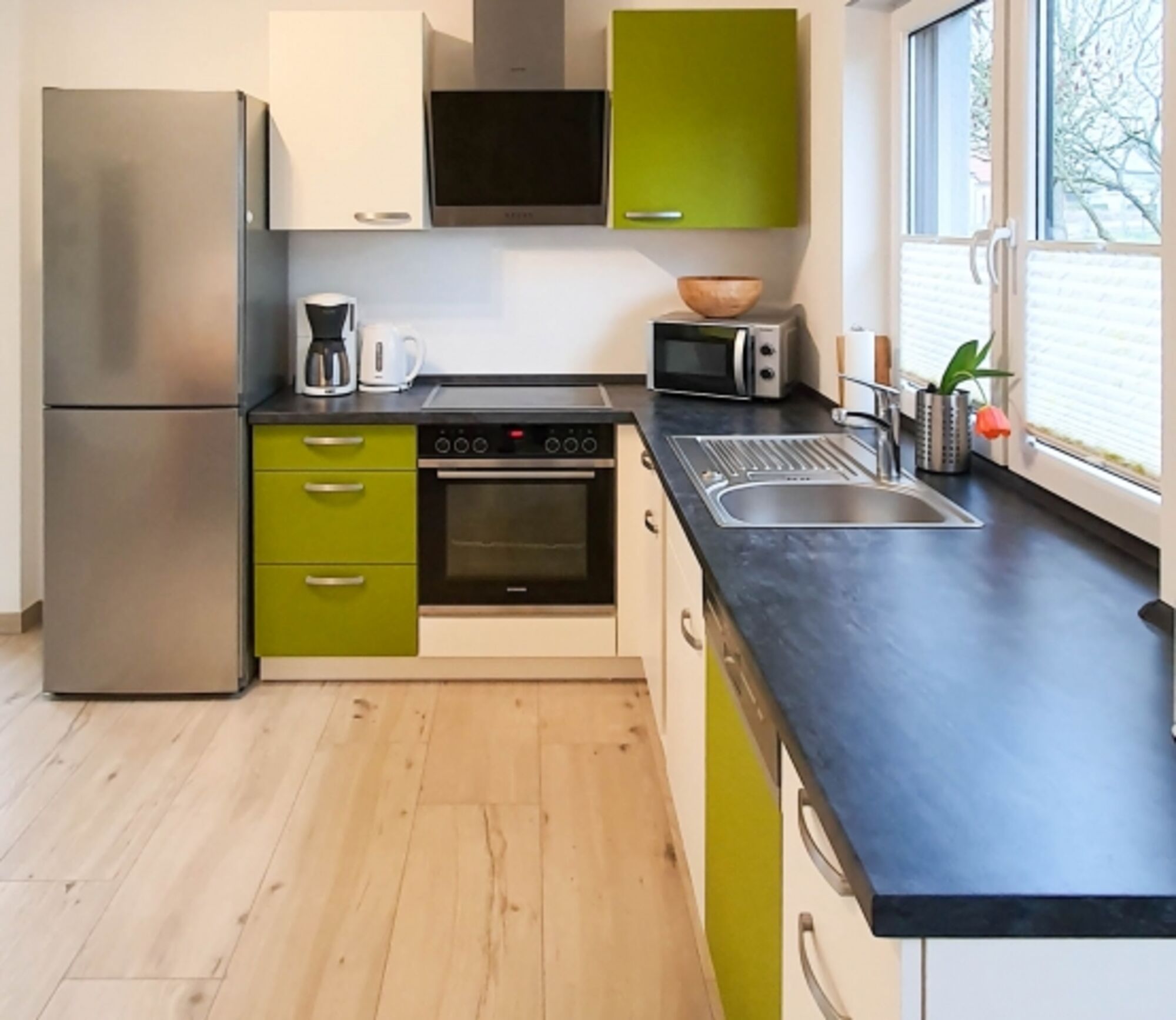 Induktionsherd, Dunstabzugshaube, Gefrierschrank, Eierkocher, Mixer, Waffeleisen, Korkenzieher / Flaschenöffner, Essplatz in der Küche