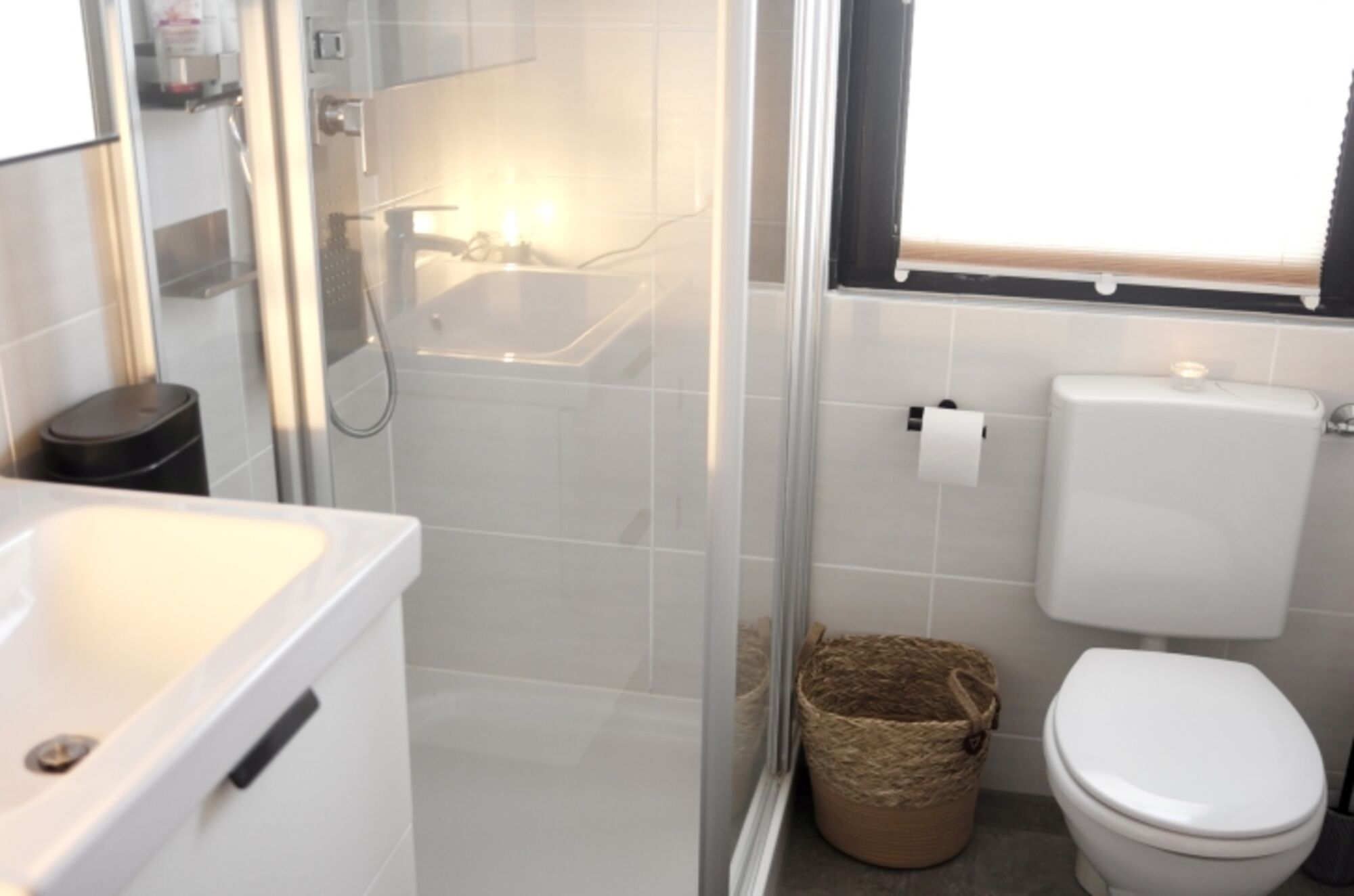 Ein frisch renoviertes Badezimmer mit Dusche und Fenster