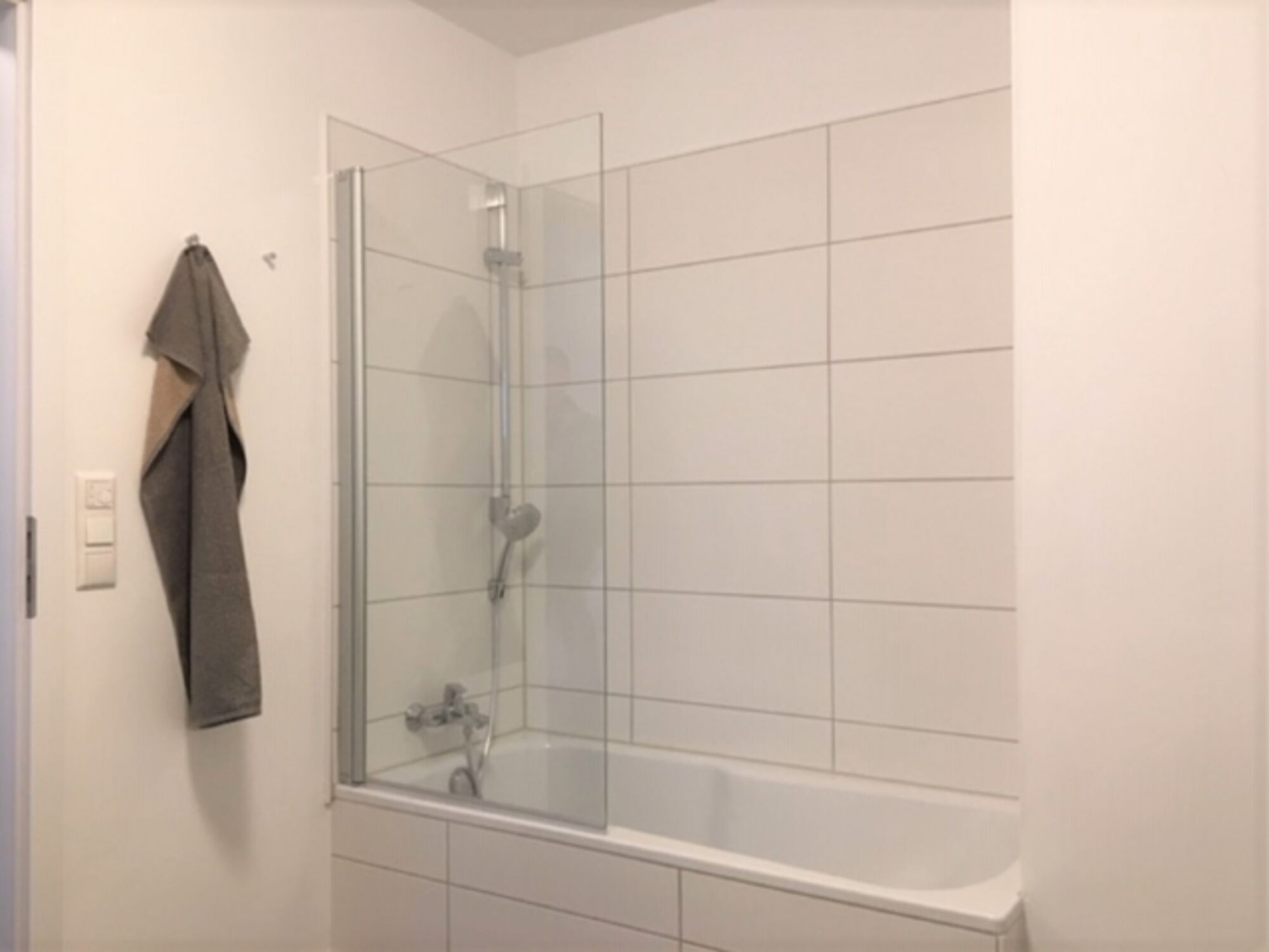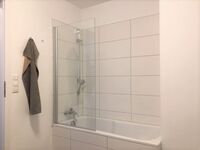 Das Badezimmer ist großzügig geschnitten und mit einer Dusche in der Badewanne ausgestattet.
