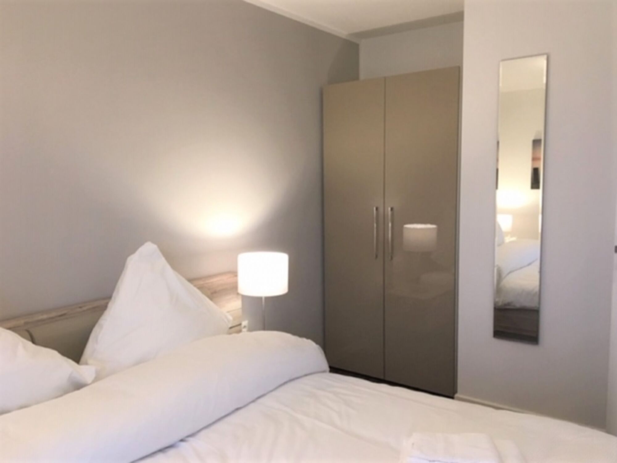 Im Schlafzimmer steht Ihnen ein Doppelbett mit Nachtkonsolen und ein Kleiderschrank zur Verfügung.