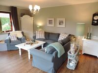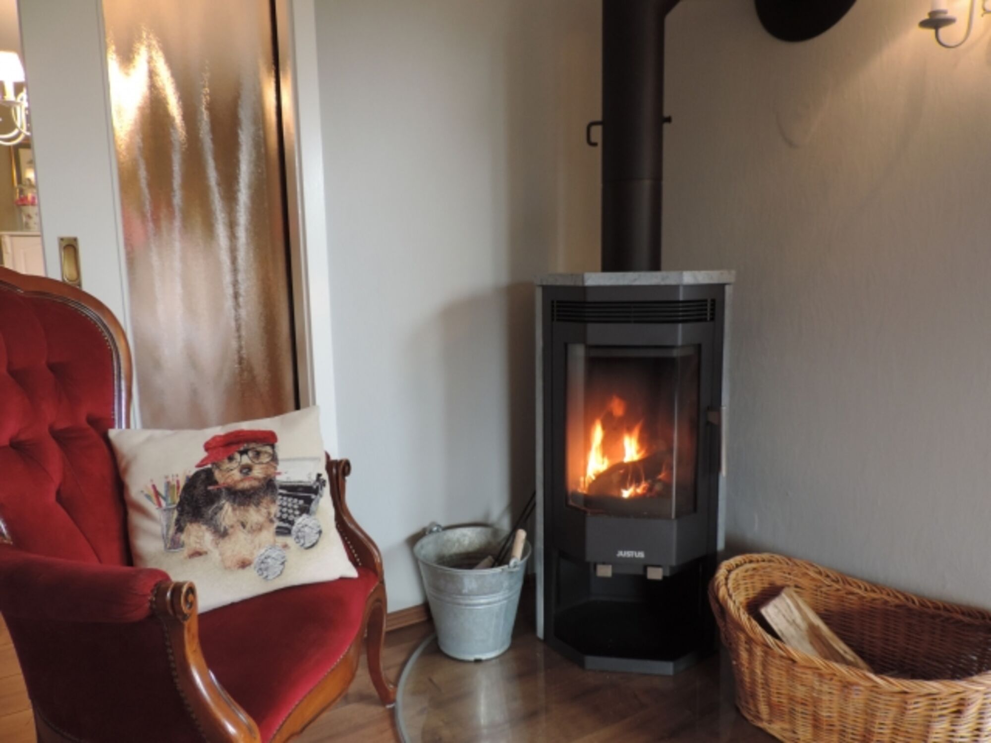 TV-Sat, TV-Flachbildschirm, DVD-Player, Bücher, Kaminofen, Eckcouch, Sessel