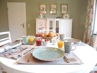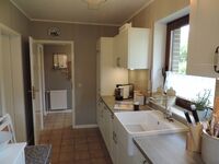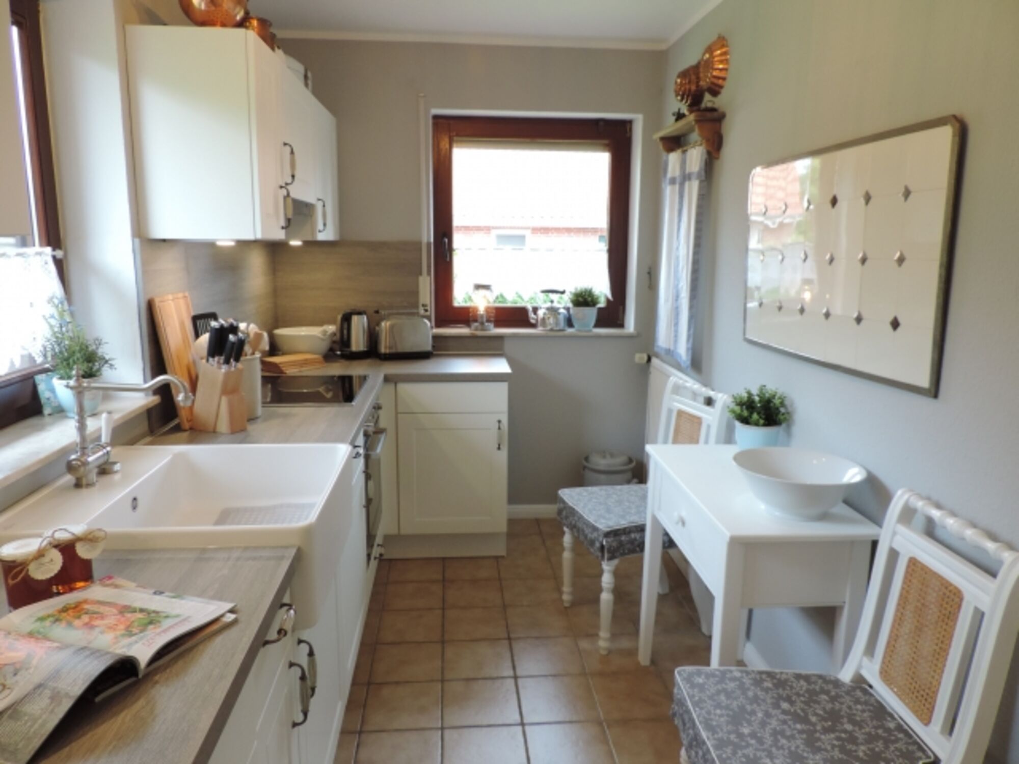Cerankochfeld, Dunstabzugshaube, Kühlschrank mit Gefrierfach, Senseo-Kaffeeautomat, Eierkocher, Küchenmaschine, Waffeleisen, Korkenzieher / Flaschenöffner, Geschirrhandtücher, Mülltüten, Essplatz in der Küche