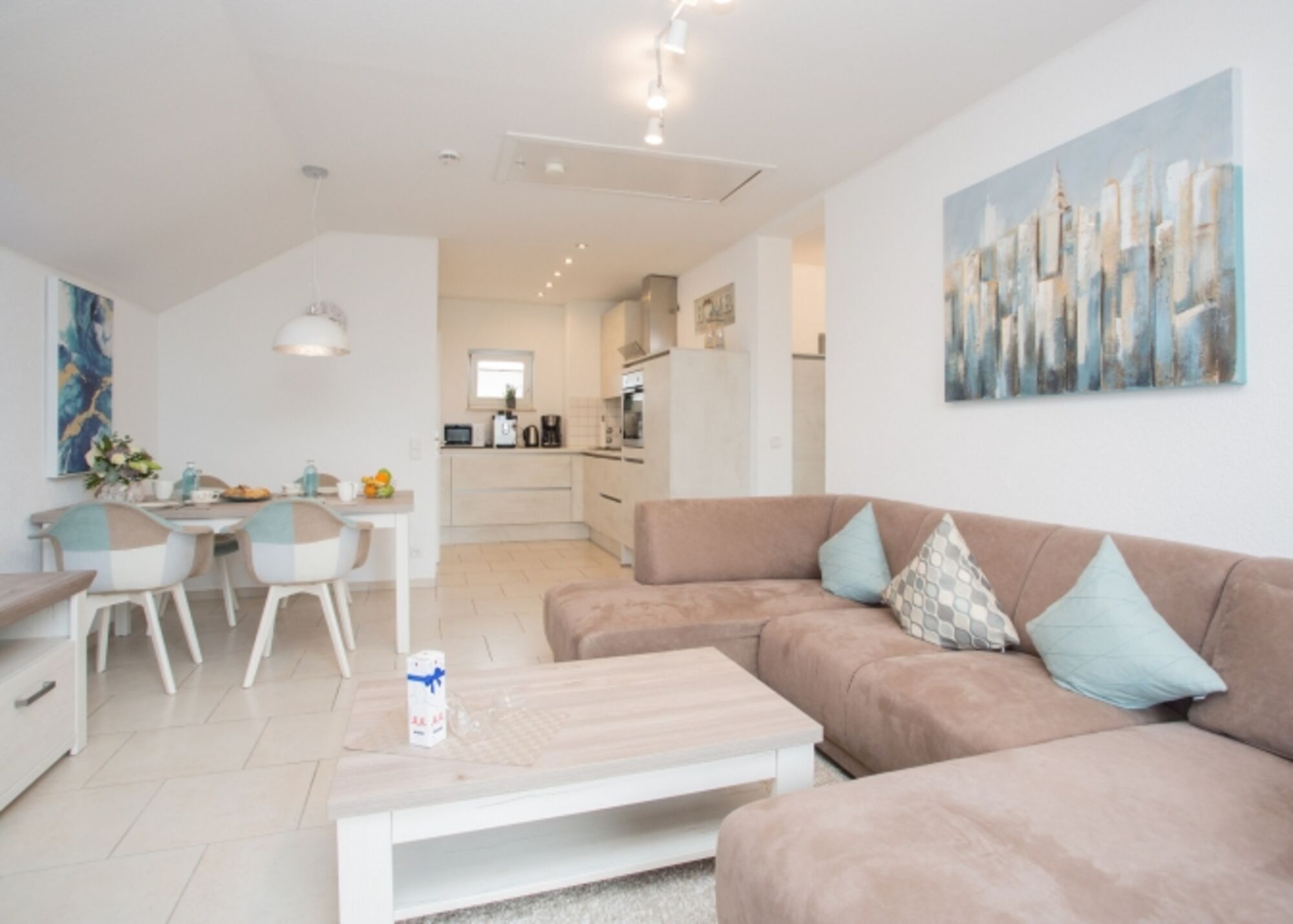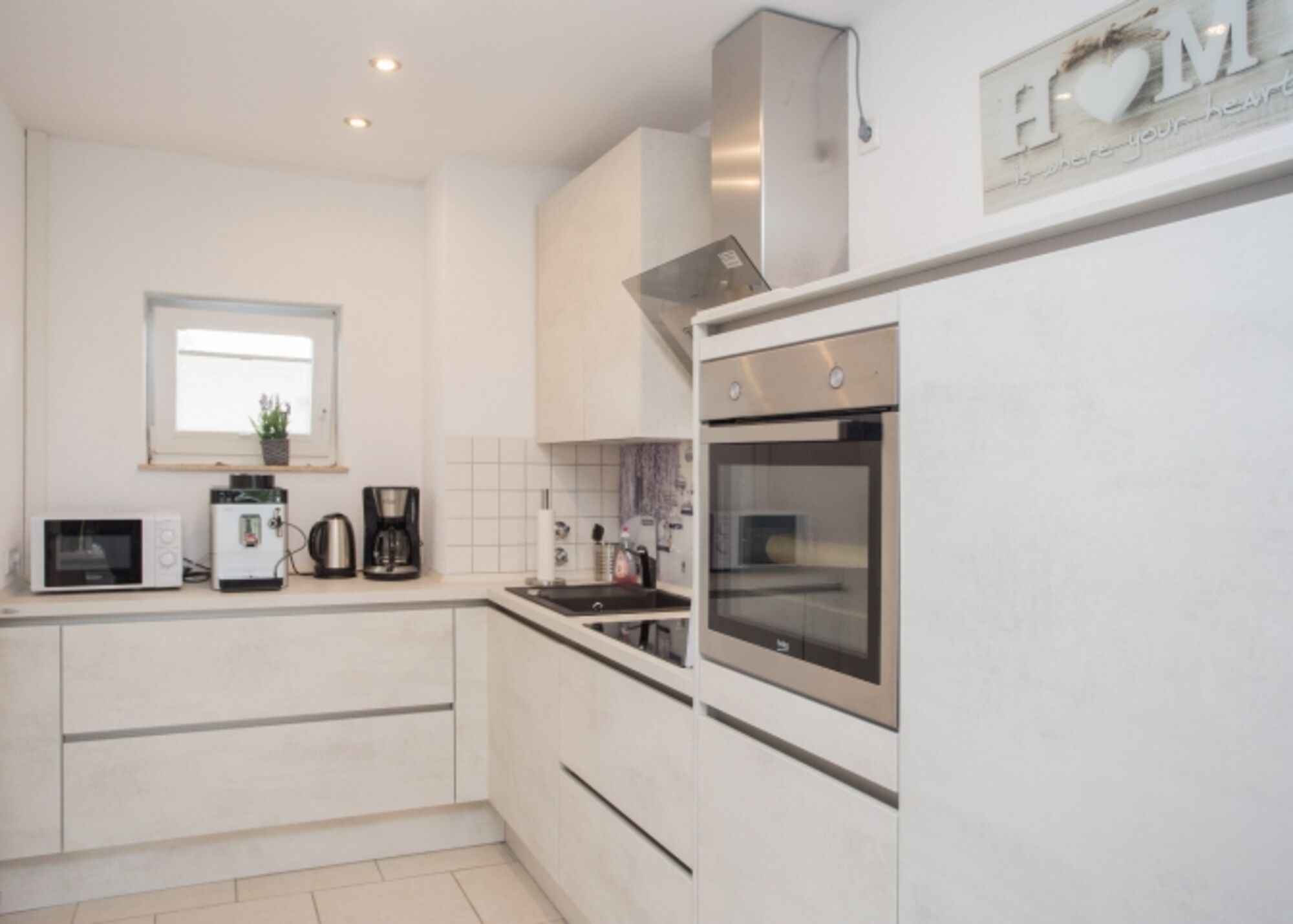 Cerankochfeld, Gasofen / Gasherd, Dunstabzugshaube, Kühlschrank mit Gefrierfach, Gefrierschrank, Kaffeevollautomat, Mixer, Geschirrhandtücher, Essplatz in der Küche