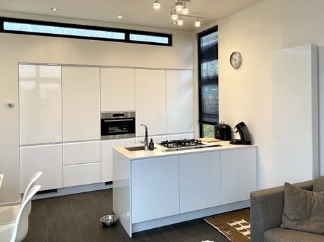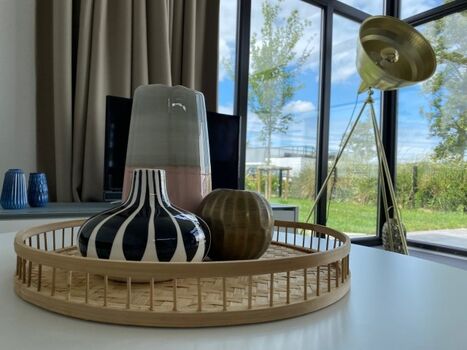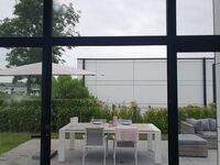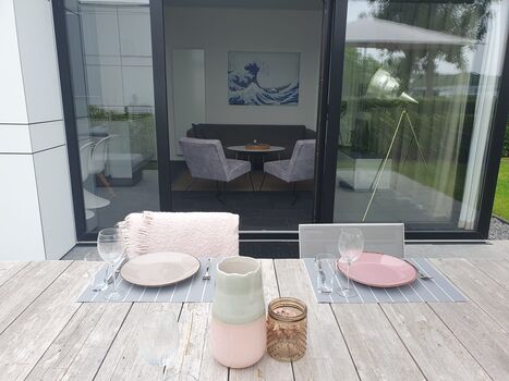 Die großen Fenster im Wohnraum bieten einen herrlichen Blick in den Garten mit Terrasse und über Seegras hinweg bis zum Deich. Das große Schiebetürelement ermöglicht einen direkten Zugang von Wohnbereich zur Terrasse. Auf der Terrasse (oder im gesonderten Abstellhäusschen) stehen bequeme Acapulco-Sessel sowie ein moderner und großer Design-Outdoor-Esstisch mit Teak-Holz-Flächen inkl. sechs bequemer Stühle. Die Terrasse geht über die gesamte Länge des Hauses.