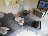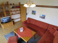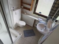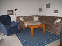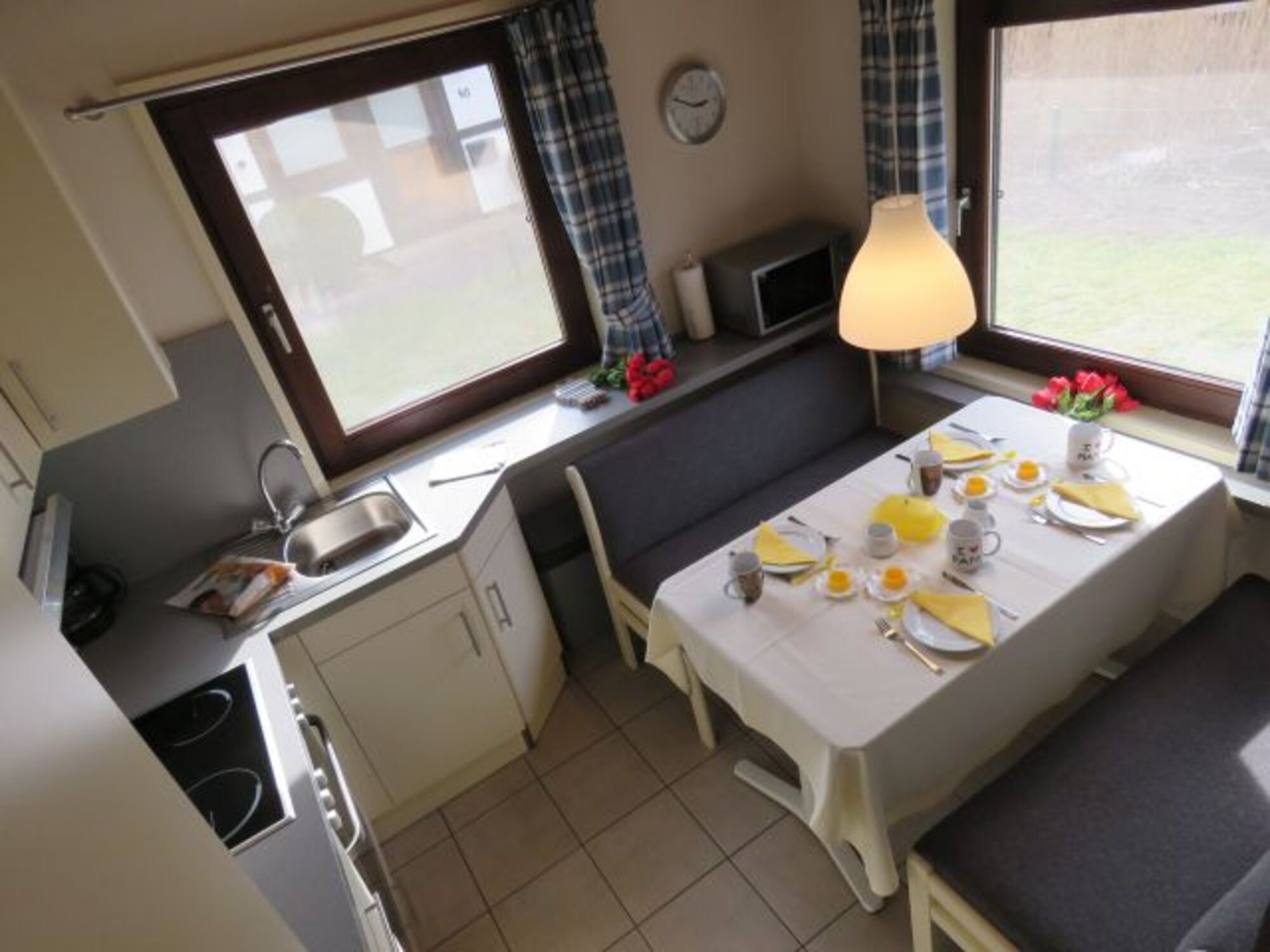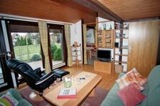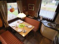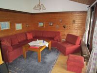 Ca. 48 m² Wohn- und Nutzfläche, bis 4 Personen. Küche mit Essecke, (4-Plattenherd, Kühlschrank/Gefrierfach)[4-Platten-Ceranfeld, Kühlschrank/Gefrierfach, Geschirrspüler, Mikrowelle], Dusche/WC. Diele, Abstellraum klein, innenliegend, 1 Schlafraum mit zwei Betten, 1 Schlafraum mit 1 Bett und einem Hochbett. Tlws. Abstellraum groß als Gerätehaus von außen begehbar. Terrasse. Das Ferienhaus ist komplett für 6 Personen eingerichtet.