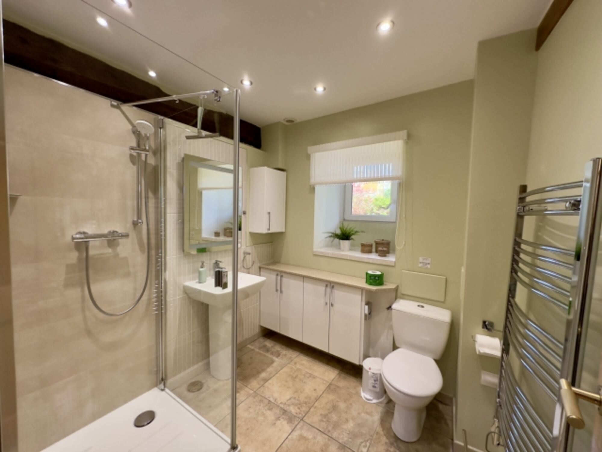 Miete von Handtüchern möglich. großzügige Dusche mit sehr niedrigem Einstieg Fußbodenheizung Waschbecken, Spiegel, Fenster im Bad
