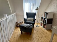 großzügiges Schlafzimmer mit einem Sofa, wenn man sich zum Lesen zurück ziehen möchte. Doppelbett 1,80 x 2,00m, Boxspringbett, Kommode, Spiegel, Leselampe am Bett