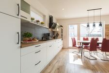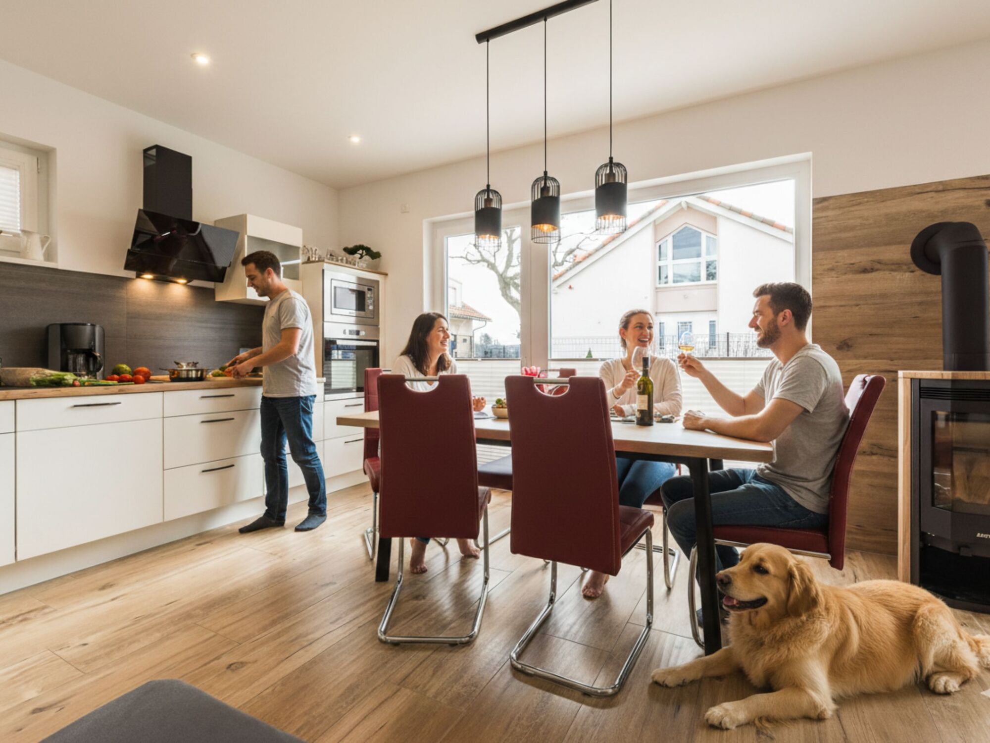 Großzügiger Ess- und Wohnbereich: Ideal für gemeinsame Stunden mit der Familie oder Freunden. Durch die offene Gestaltung und großen Fensterfronten genießen Sie viel Licht und einen herrlichen Blick ins Grüne.