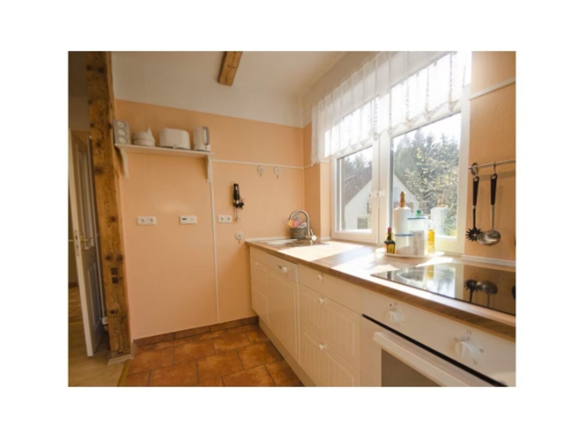 Cerankochfeld, Kühlschrank mit Gefrierfach, Nespresso-Automat, Eierkocher, Mixer, Korkenzieher / Flaschenöffner, Geschirrhandtücher, Mülltüten, Essplatz in der Küche
