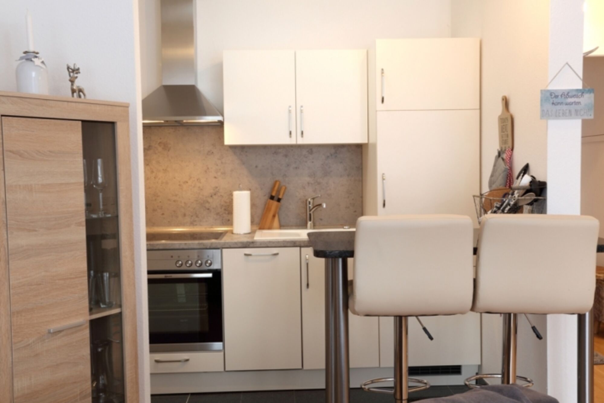 Die nagelneue Küchenzeile verfügt über ein Ceranfeld, Backofen, Geschirrspüler, Kühlschrank mit 3 *** Gefrierfach, Kaffeemaschine, Toaster, Wasserkocher und allem, was an Utensilien in einer Küche benötigt wird. So können Sie jederzeit in gemütlicher Runde etwas Leckeres zaubern oder einfach unabhängig sein von den Öffnungszeiten und Speisekarten der zahlreichen, umliegenden Restaurants und Gaststätten.
