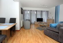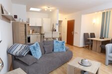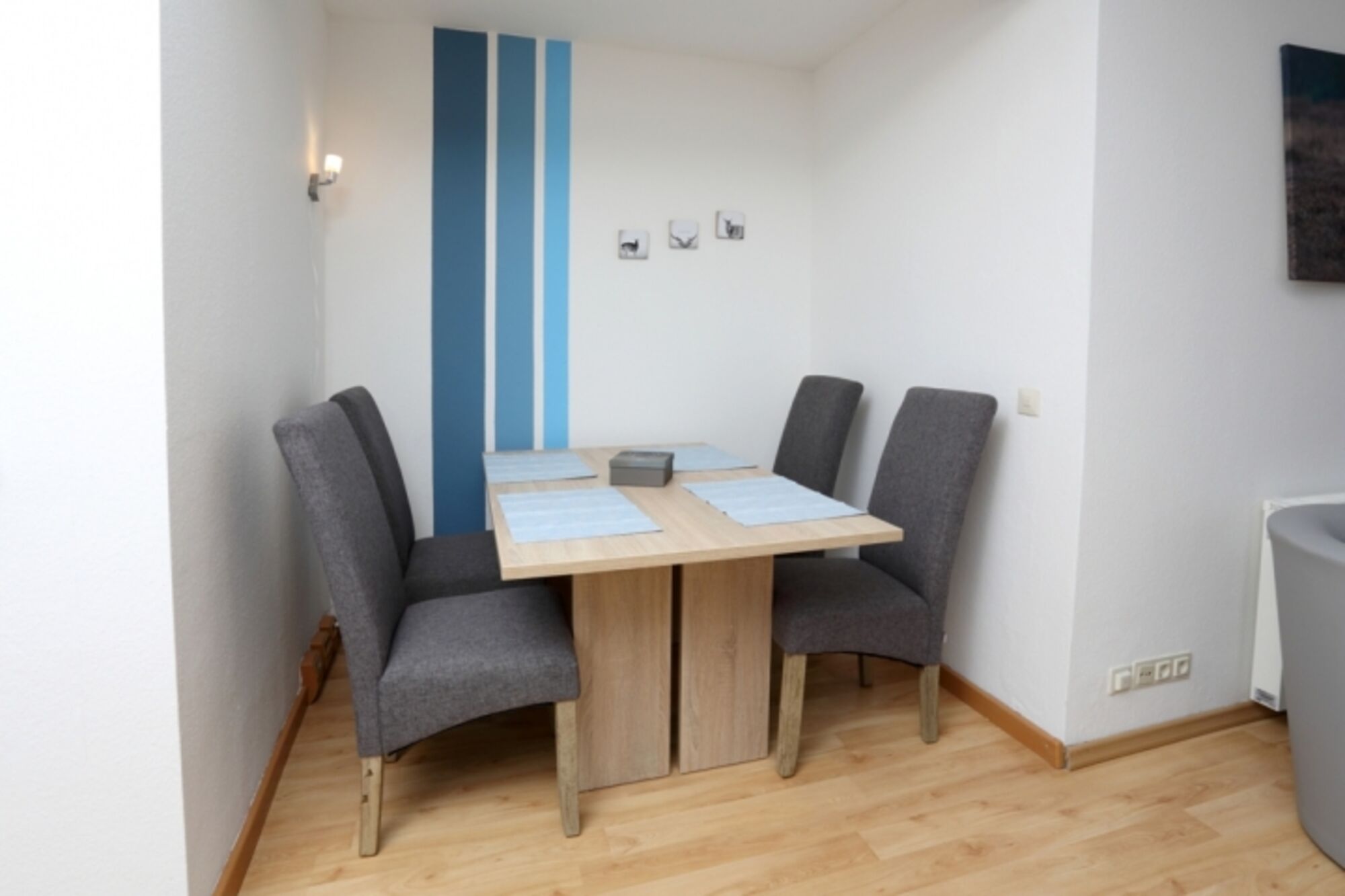 Das zeitgemäße und moderne Wohnzimmer ist ausgestattet mit einer komfortablen Schlafcouch mit Federkern (1,40 x 2,00 m), einer Essecke für 4 Personen, zwei Sesseln, einem SAT-Flat-Screen-TV mit DVD-Player, Radio und kostenfreiem DSL 16000 Internetzugang mit WLAN. Durch die große Fensterfläche, die sich auf ca. 2,50 Meter Breite zum Süd-Balkon hin öffnen lässt, genießen Sie bei Freiluft einen sonnigen Ausblick. In unseren Wohnungen liegen immer Bücher für unsere Gäste bereit, mit denen Sie sich die Zeit vertreiben können und die im Anschluss bei Interesse gern kostenlos in den heimischen Bücherschrank "überführt" werden können.