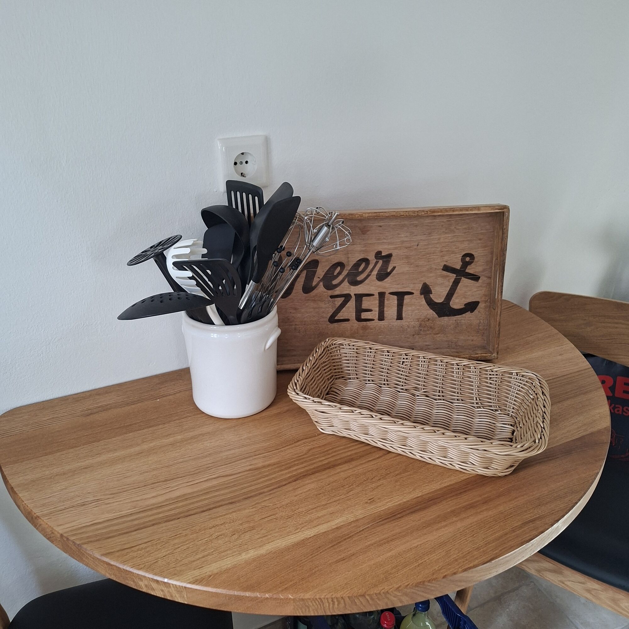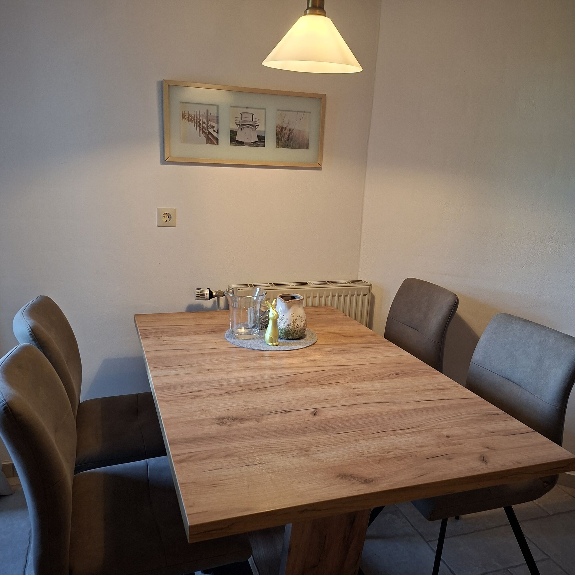 Cerankochfeld, Dunstabzugshaube, Kühlschrank mit Gefrierfach, Senseo-Kaffeeautomat, Korkenzieher / Flaschenöffner, Geschirrhandtücher, Essplatz in der Küche