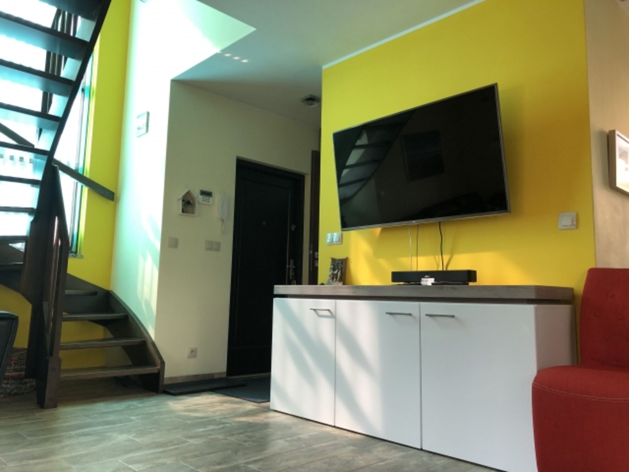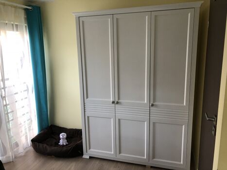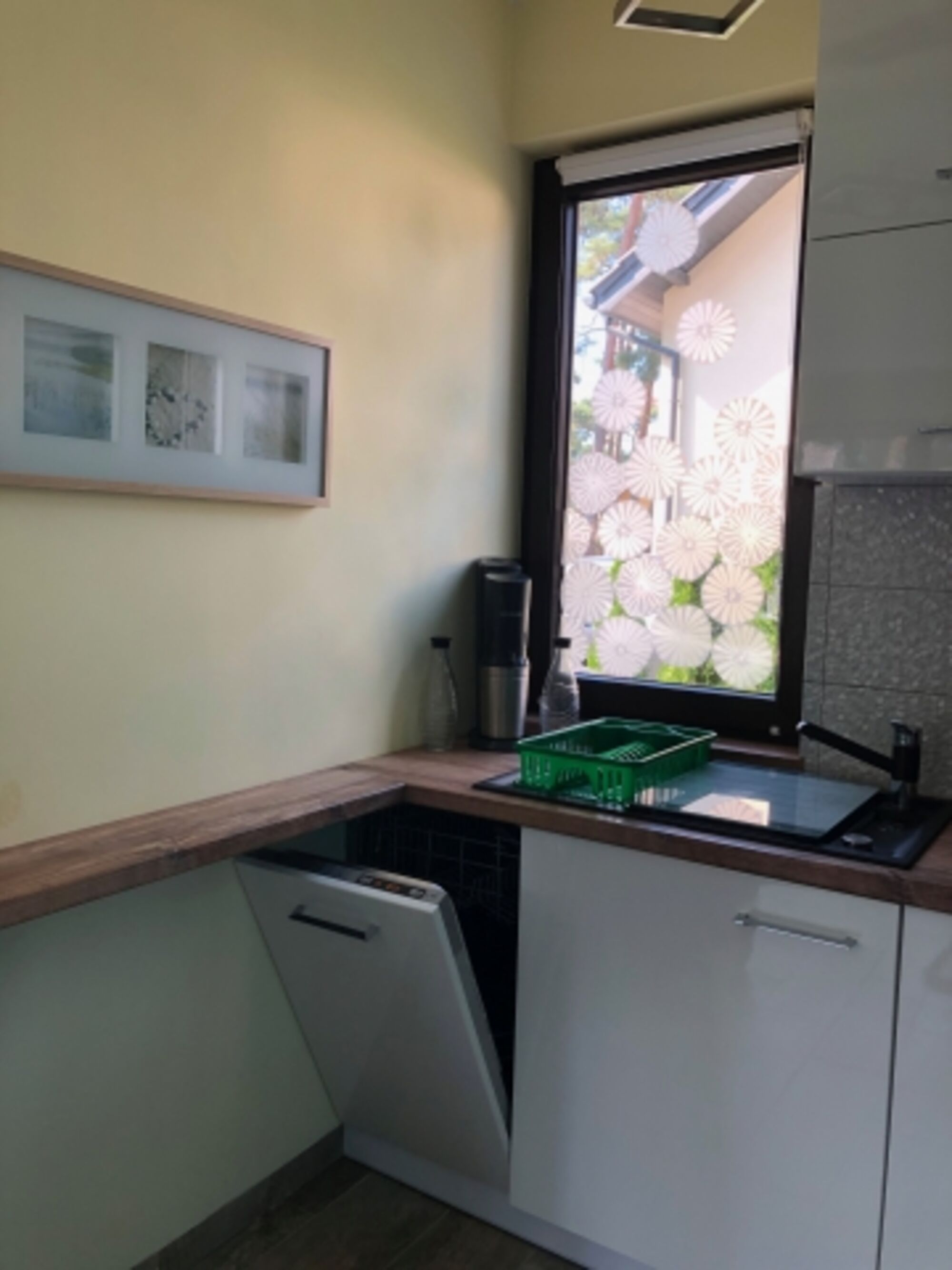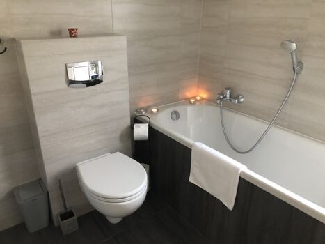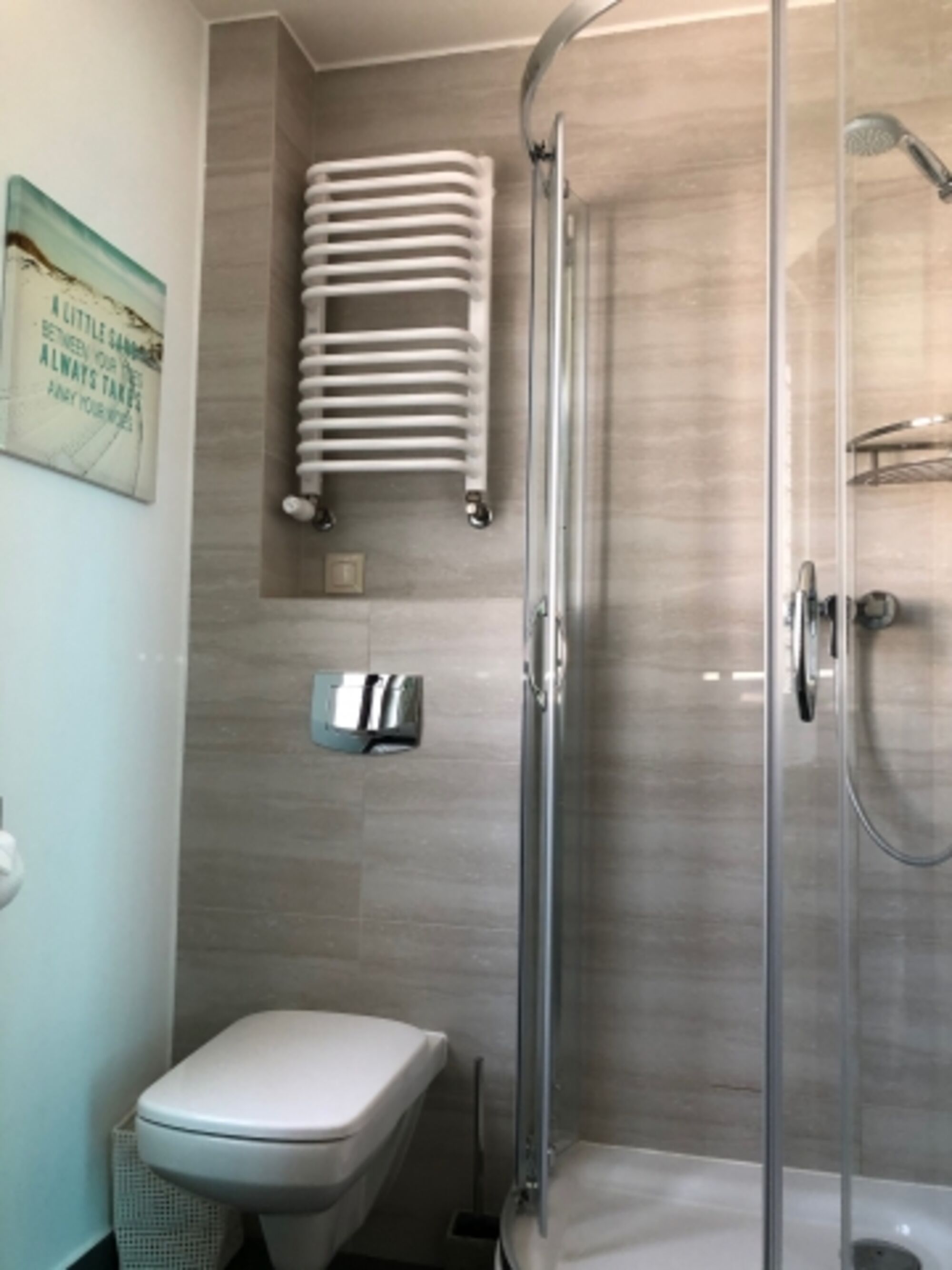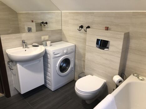 There are 2 bathrooms: 1 with shower/WC and 1 big one with bathtub/WC and washing machine which you use for free. Besides the big bathroom you will have 2 bedrooms (1 queensize bed, 1 with 2 single beds) on the first floor. The living room with dining area and open kitchen as well as the smaller bath are situated on the ground floor.