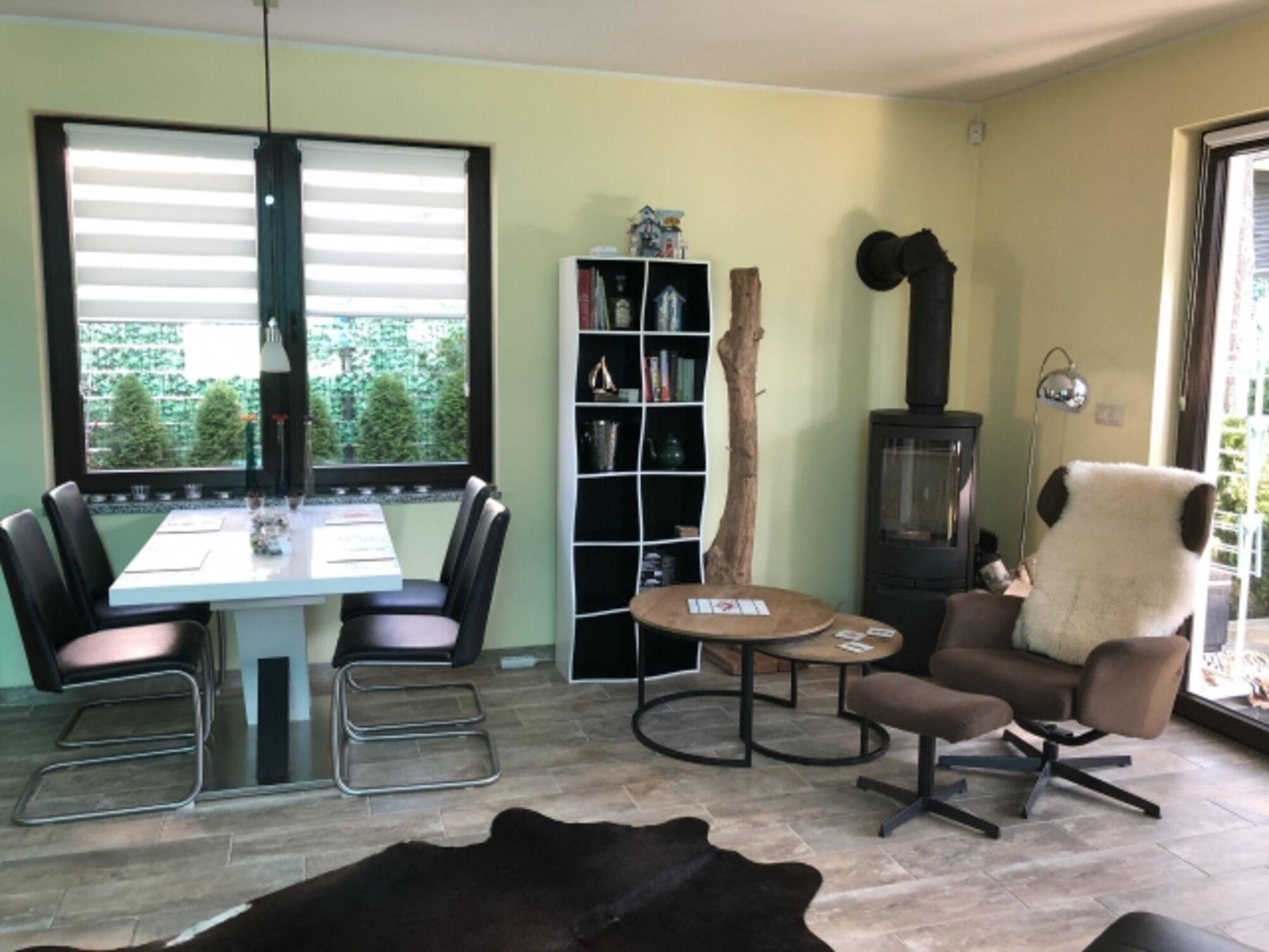 Zurück im Haus gibt es eine Leder-Couchecke sowie einen Relax-Sessel zum Einkuscheln und der Kaminofen zaubert Gemütlichkeit an kühlen Abenden oder frostigen Tagen - besonders schön ist's im Herbst und Winter (dazu gibt es im gesamten Haus Fußbodenheizung, damit niemand frieren muss, wenn der Kaminofen nicht angefeuert wird ;-).