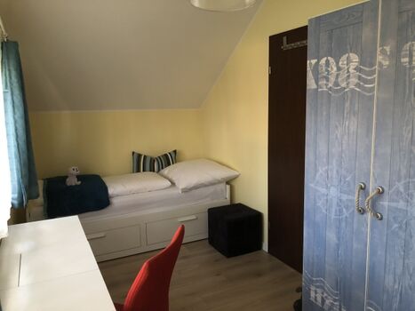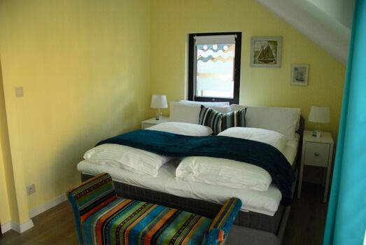Kleines gemütliches Doppelzimmer mit Platz für ein große Hundebett - lichtdurchflutet, wenn gewollt, ansonsten Verdunkelungsmöglichkeit an beiden Fenstern Doppelbett 1,60 x 2,00m, Leselampe am Bett