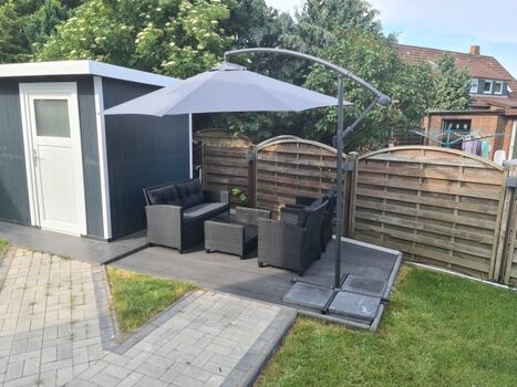 Die Terrasse ist voll möbliert mit Tisch & Stühlen. Hier dürfen Sie auch gerne Ihre Zigarette genießen.