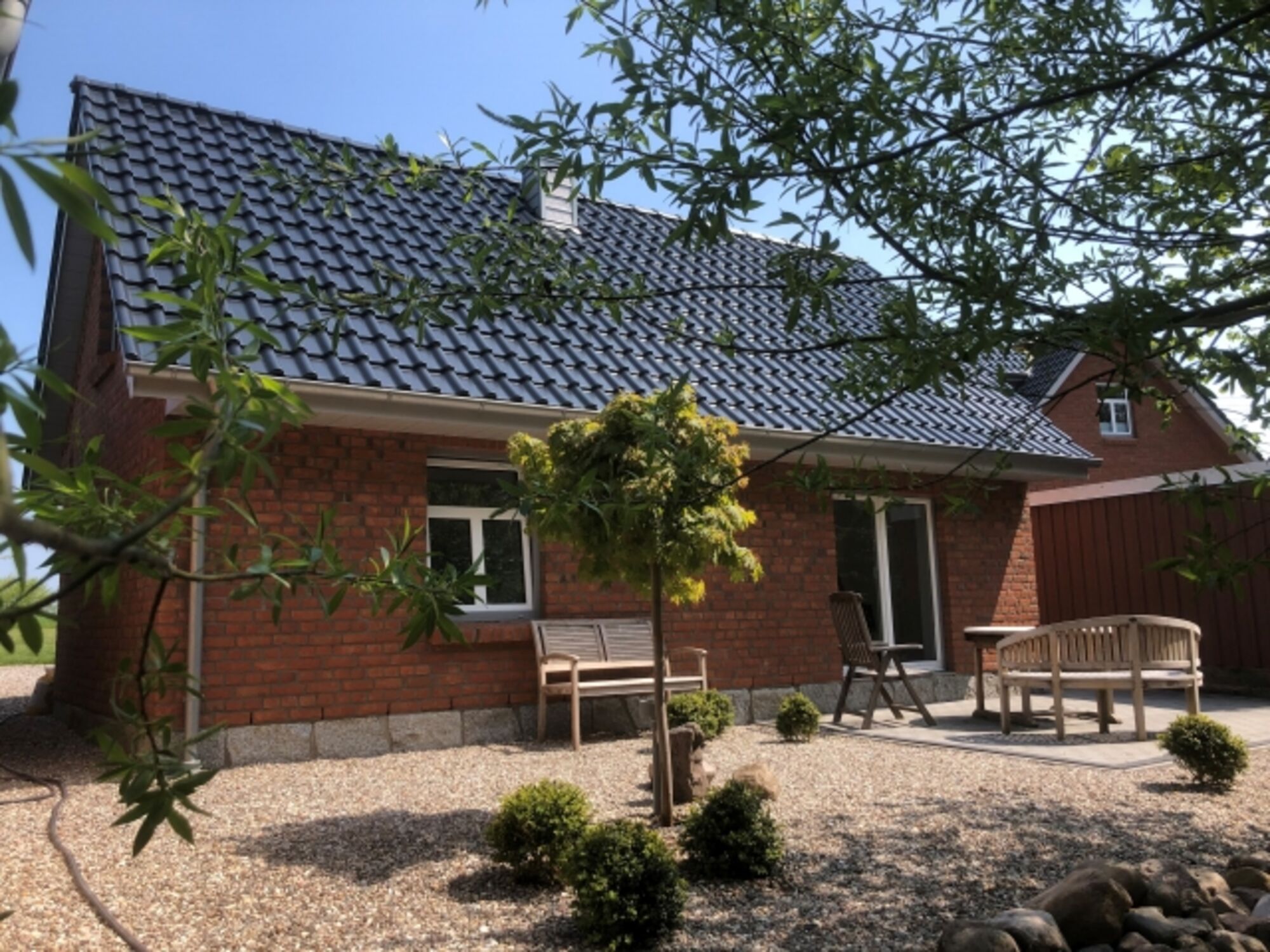 Im Außenbereich erwartet Sie eine eigene Terrassen mit Teakholz Gartenmöbeln. Der weitläufige Garten grenzt an die Hauskoppel mit direktem Zugang zur Lippingau und dem Wanderweg zum Strand oder nach Gut Oestergaard mit Ferienreitschule.