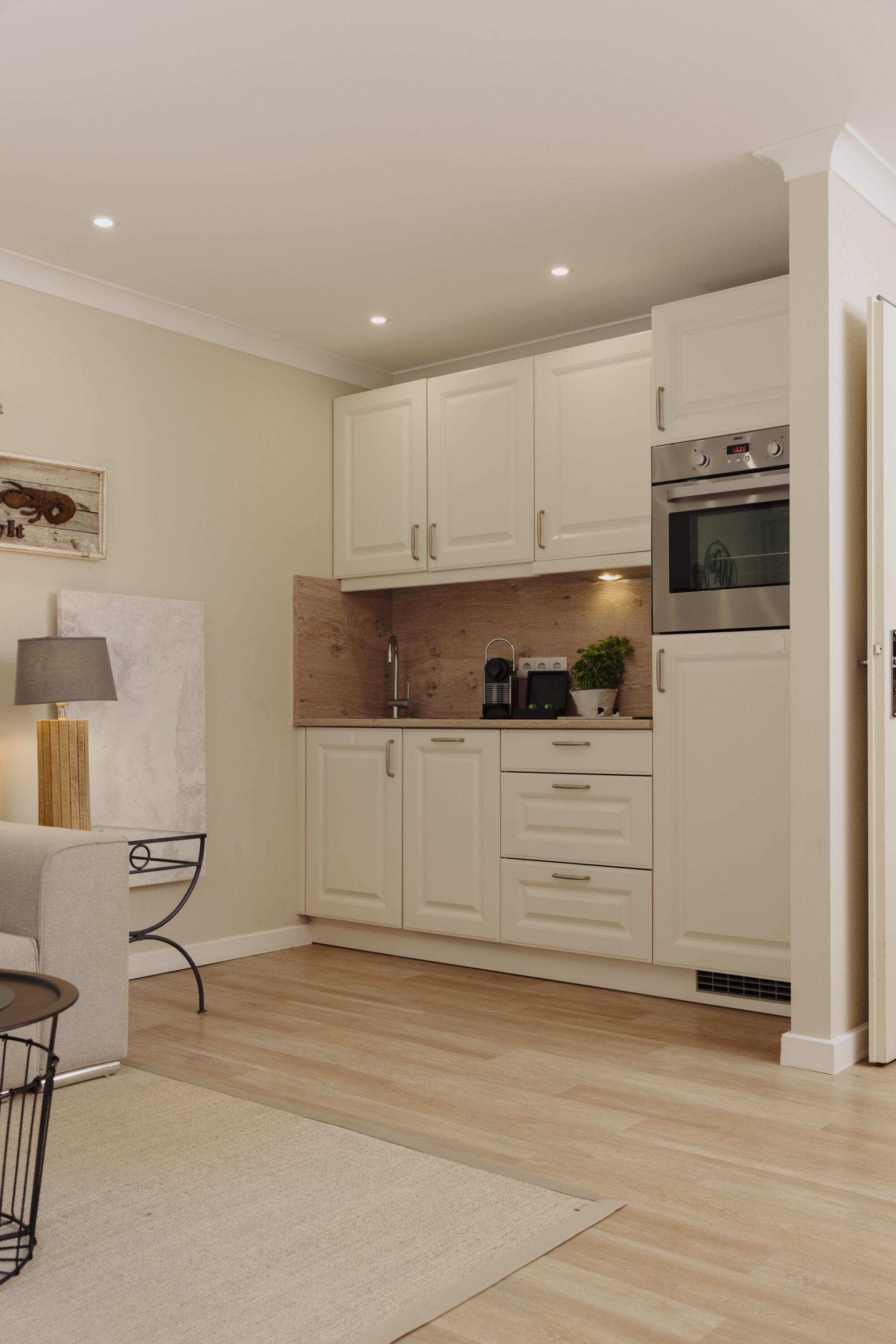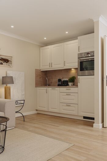 2-Platten Herd, Cerankochfeld, Kühlschrank mit Gefrierfach, Nespresso-Automat, Eismaschine, Geschirrhandtücher, Mülltüten, Essplatz in der Küche