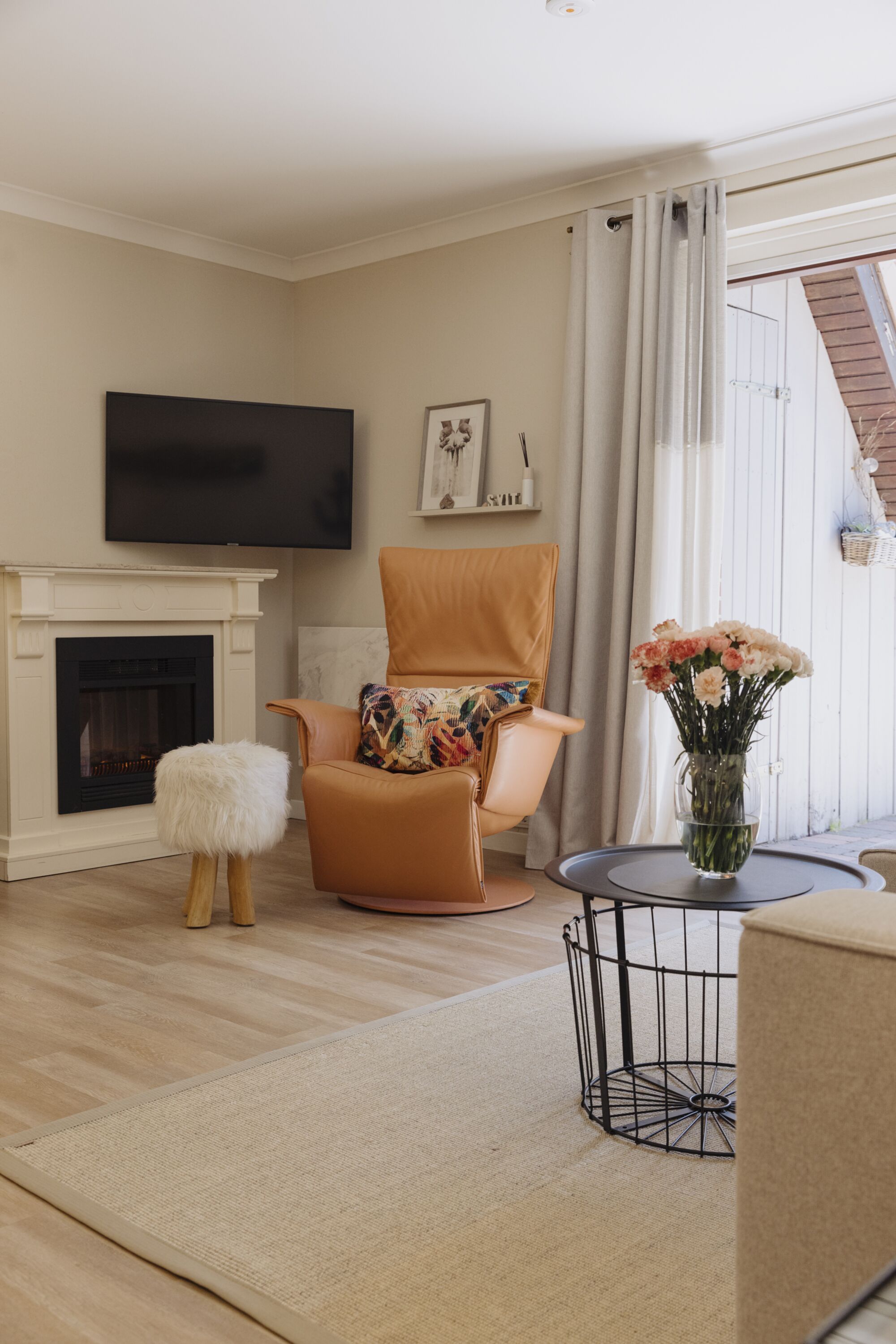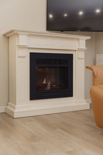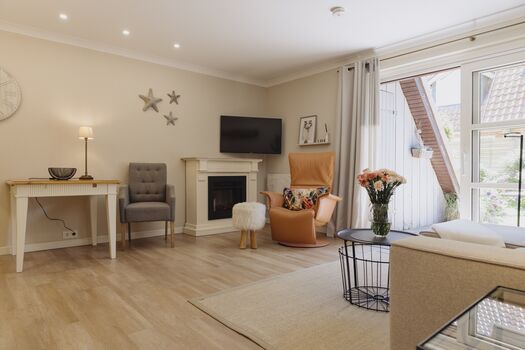 Entspannen Sie sich im behaglichen Wohnzimmer und „entern“ Sie von hier aus Ihrer eigenen Terrasse in Südlage, auf der Sie geschützt die Sonne genießen können. An kälteren Tagen sorgt ein Elektrokamin für behagliche Wärme.