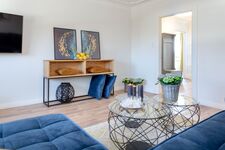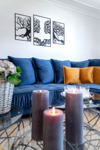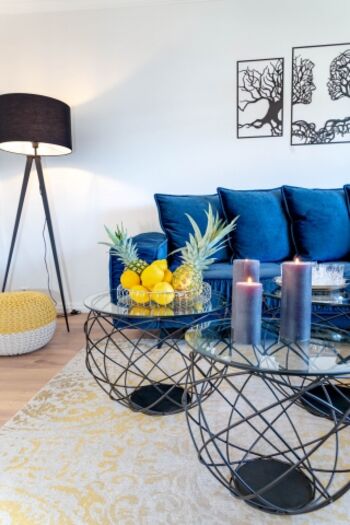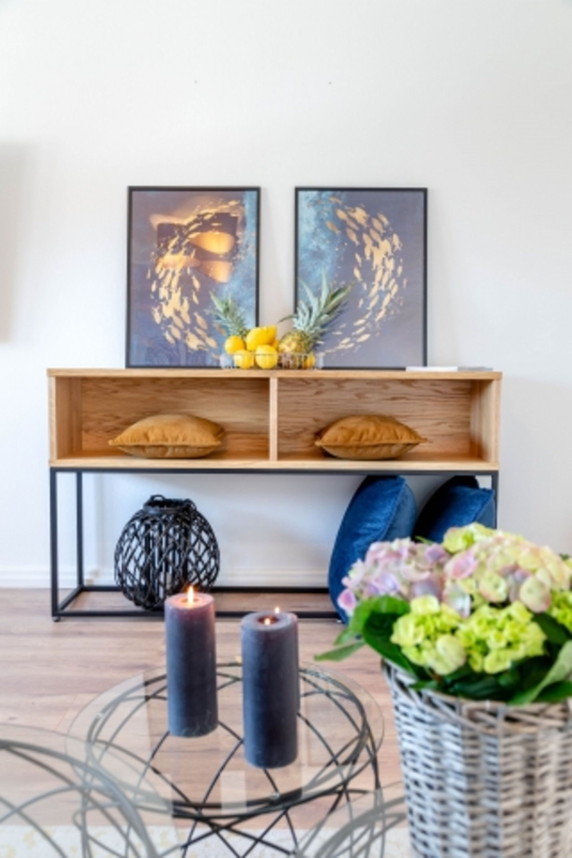 Entspannen Sie sich im hellen und exklusiv dekorierten Wohnbereich auf gemütlichen Sofa-Elementen und nutzen Sie die separate und hochwertig ausgestattete Küche für die mühelose Selbstversorgung im Urlaub.