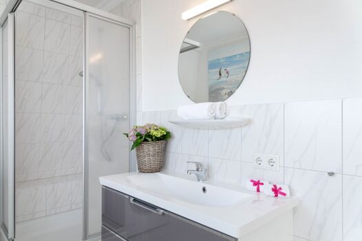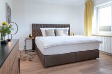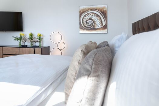 Die Wohnung verfügt über zwei Schlafzimmer, die jeweils über ein komfortables Boxspringbett verfügen. Das geräumige Badezimmer bietet Ihnen eine Dusche, Waschmaschine mit Trockner Funktion und eine Sitzmöglichkeit, sodass Sie hier Ihre eigenen kleinen Wellness-Momente gestalten können.