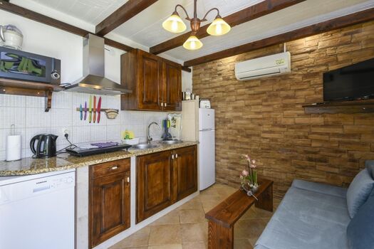 2-Platten Herd, Cerankochfeld, Induktionsherd, Dunstabzugshaube, Kühlschrank mit Gefrierfach, Gefrierschrank, Kaffeevollautomat, Korkenzieher / Flaschenöffner, Geschirrhandtücher, Essplatz in der Küche, TV in der Küche