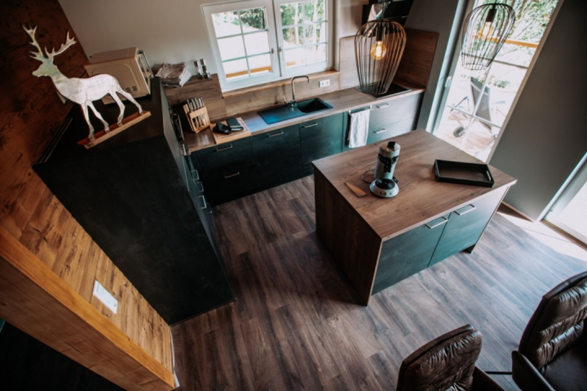 Das Herzstück des Hauses ist ein großer offener Bereich mit Küche/Esszimmer und Wohnzimmer, mit Zugang zu der Terasse. Zur Gemütlichkeit trägt der Kaminoffen bei.