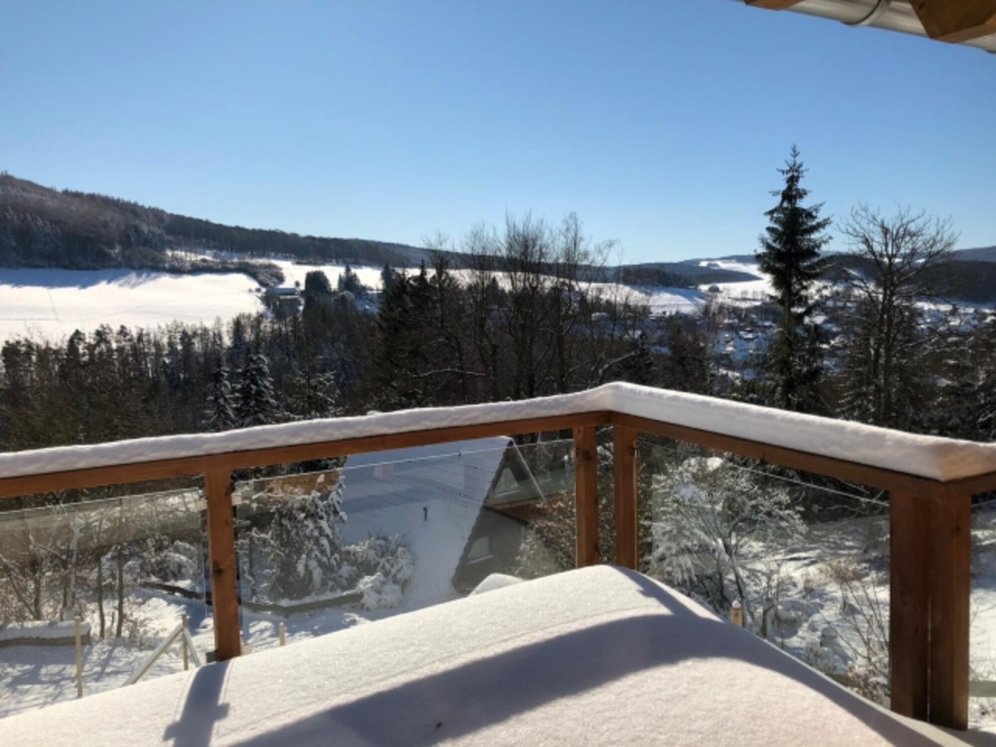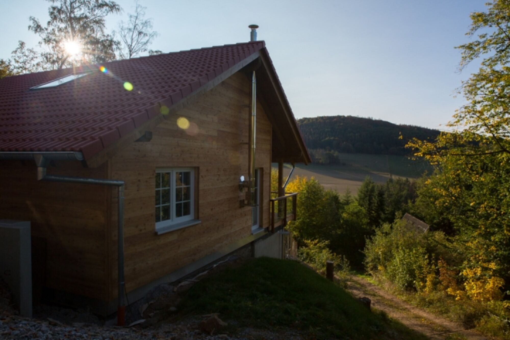 Das neu erbaute Holzhaus liegt auf dem Sankt Muffert Berg, und bietet von der 48qm großen teilüberdachten Terasse eine fantastische Aussicht. Das 1200 qm Grundstück steht zur alleinigen Nutzung zu Verfügung.