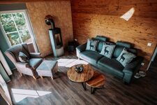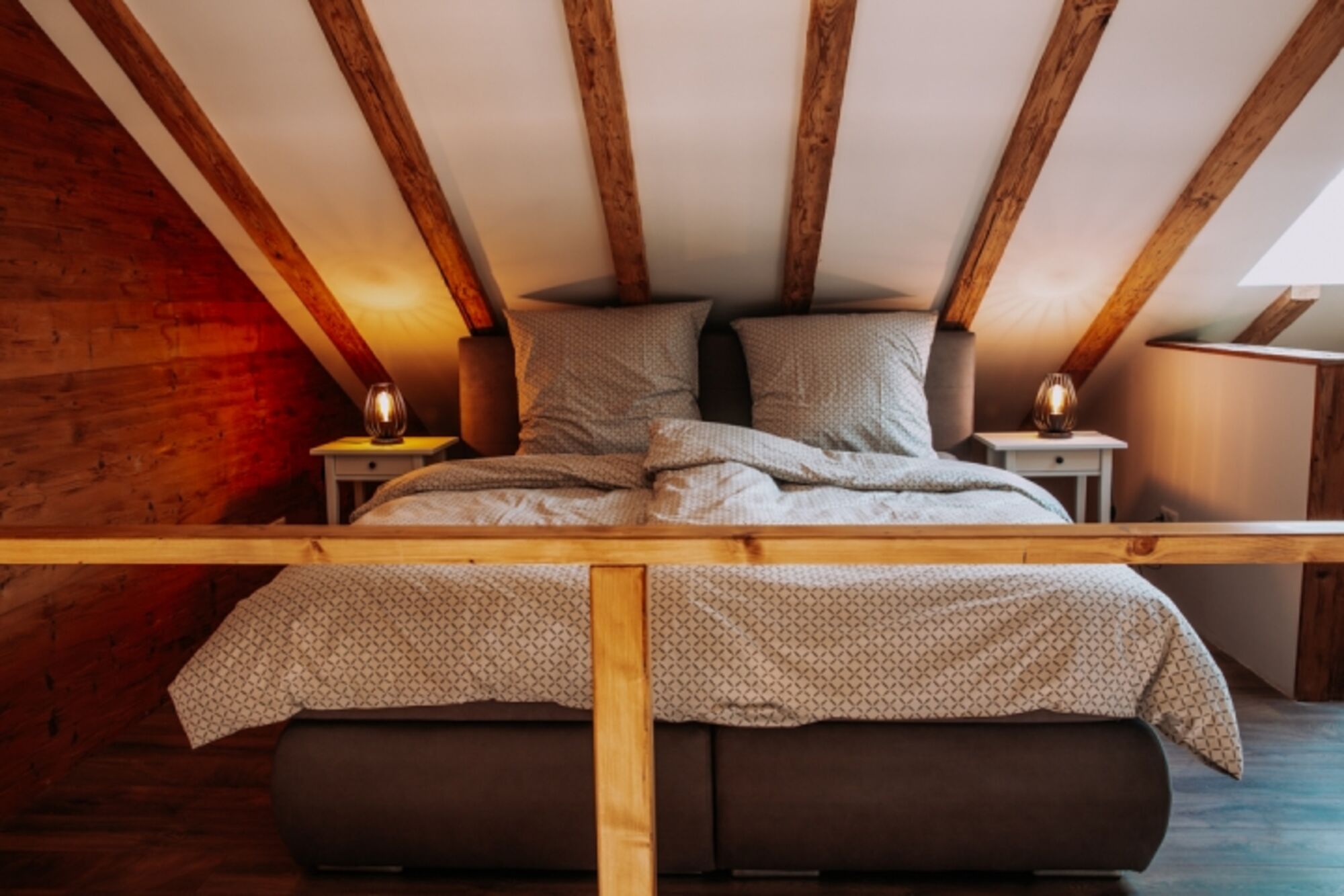 Das Obergeschoss ist eine offene Galerie mit einem weiteren Boxspringbett und einem Relaxbereich.