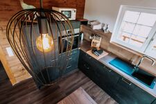 Cerankochfeld, Dunstabzugshaube, Kühlschrank mit Gefrierfach, Senseo-Kaffeeautomat, Mixer, Korkenzieher / Flaschenöffner, Gewürze (Salz, Pfeffer, Zucker), Geschirrhandtücher, Mülltüten, Essplatz in der Küche, TV in der Küche
