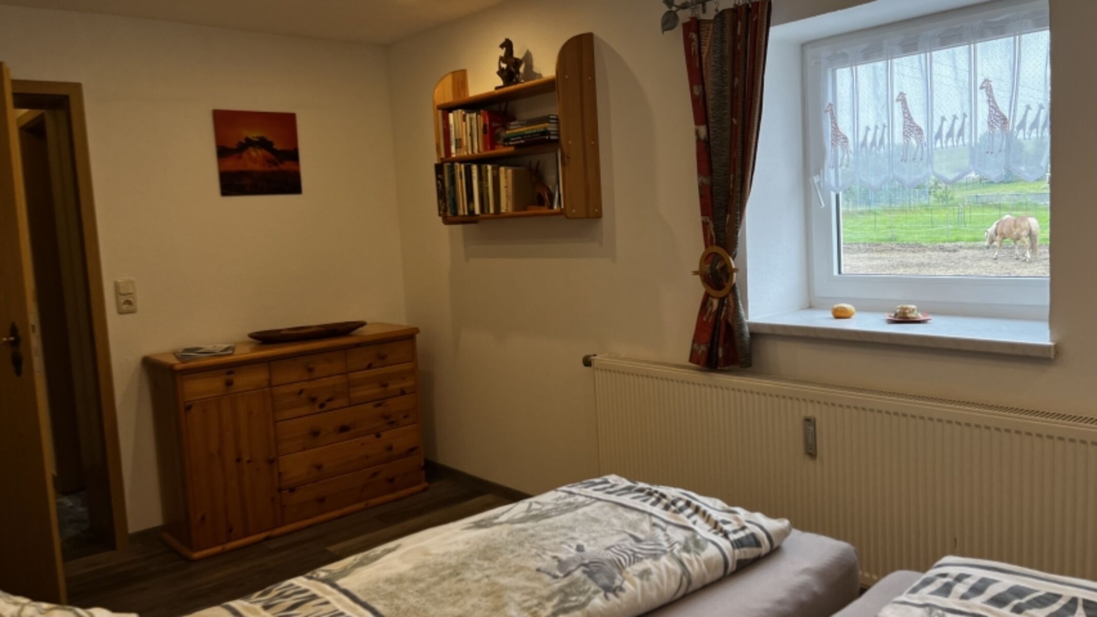 Einzelbett, Fliegengitter, Kommode, Leselampe am Bett, Spiegel