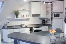 4-Platten Herd, Cerankochfeld, Dunstabzugshaube, Kühlschrank mit Gefrierfach, Kaffeevollautomat, Mixer, Gewürze (Salz, Pfeffer, Zucker), Öl / Essig, Essplatz in der Küche