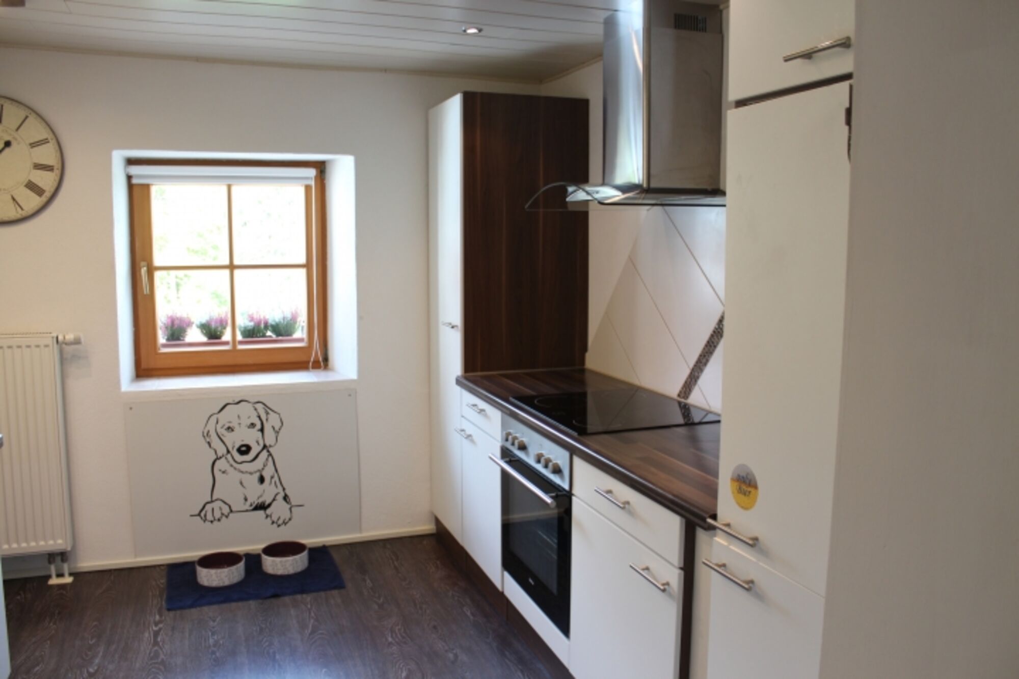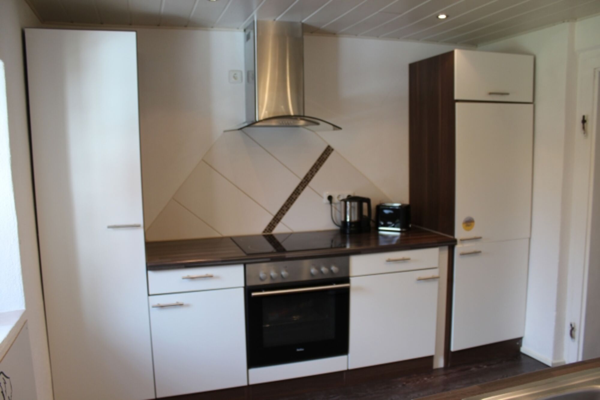 Cerankochfeld, Dunstabzugshaube, Kühlschrank mit Gefrierfach, Korkenzieher / Flaschenöffner, Geschirrhandtücher, Mülltüten