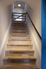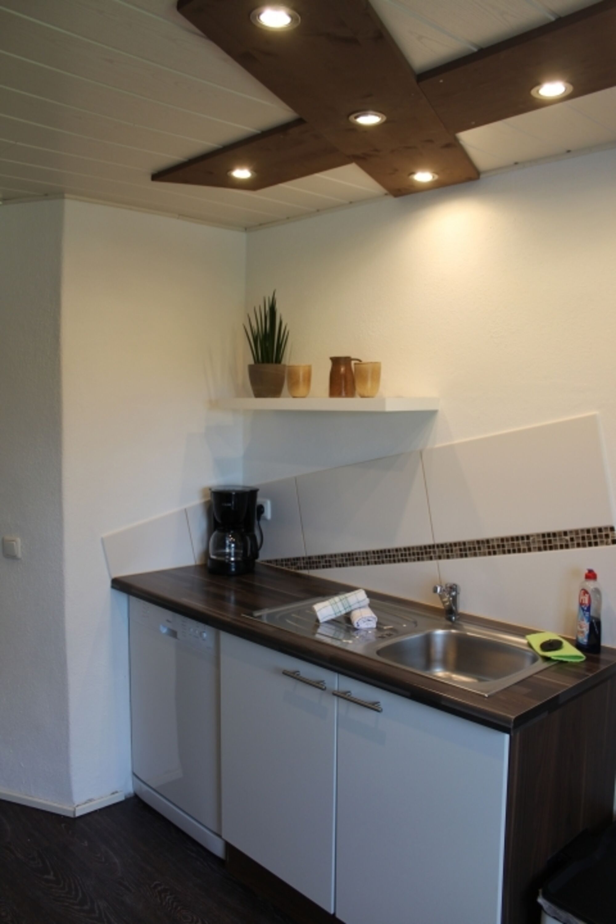 Über 14 Stufen gelangt ihr in die Wohnung. Vom Flur aus führt der Weg links in die geräumige, voll ausgestattete Küche und in das helle Bad mit ebenerdiger Dusche.