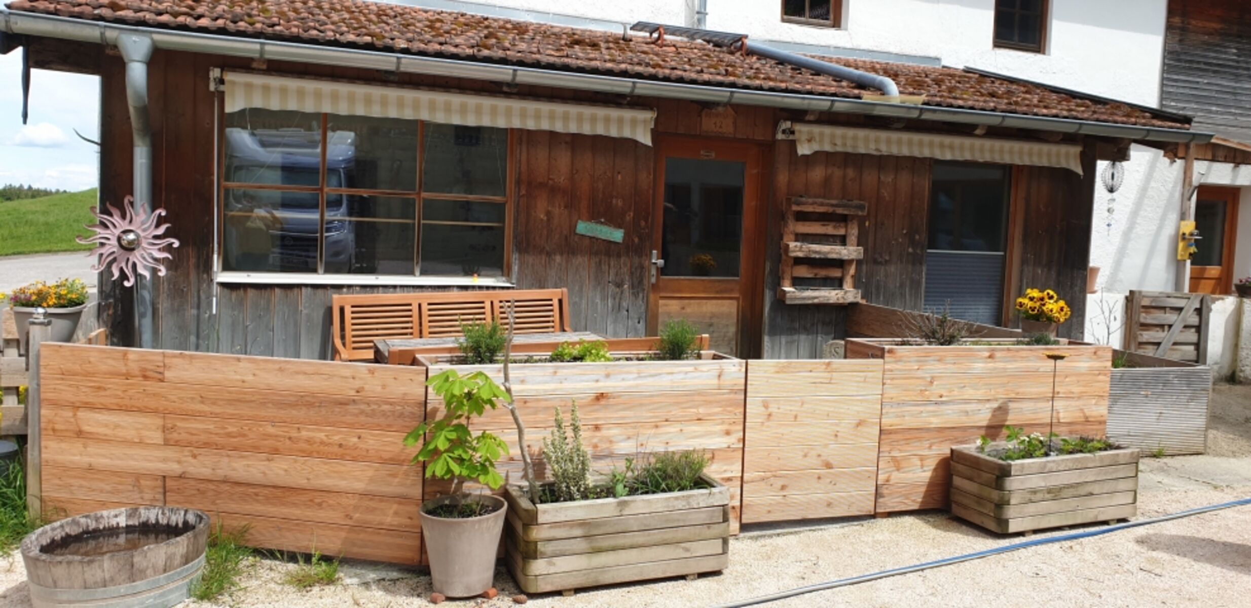 Vor dem Haus befindet sich eine separat eingezäunte Terrasse, die im Sommer lange in der Sonne liegt – der perfekte Platz für Frühstück im Freien oder gemütliche Nachmittage mit Fellnase.