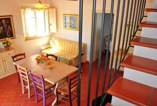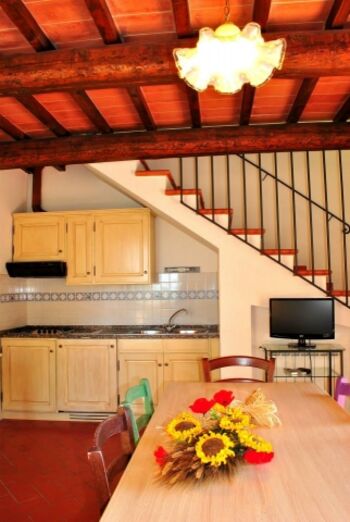 Diese 3-Zimmer-Wohnung besteht aus zwei Schlafzimmer, ein mit zwei Betten und die andere mit einem Doppelbett. Die Wohnung verfügt über zwei Etagen, Erdgeschoss und 1. Stock. Im Erdgeschoss das Schlafzimmer mit zwei Betten, Wohnraum mit komplett eingerichteter Kochecke, eine private Terrasse vor der Eingangstür mit Tisch und Stühlen, um draußen zu essen. Im Ersten Stock das Schlafzimmer mit Doppelbett und Badezimmer mit Dusche. Von einer Tür des Schlafzimmers im Erdgeschoss erreicht man den Garten auf hintere Seite des Hauses. Borgo Collelungo ist eine kleine Ferienanlage und verfügt über 6 3-Zimmer-Wohnungen.