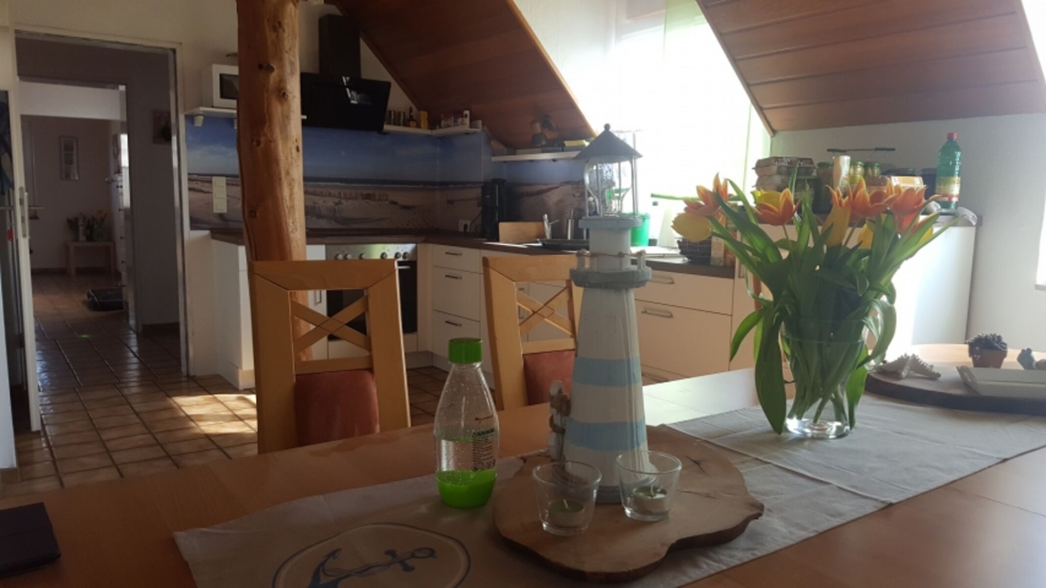 4-Platten Herd, Cerankochfeld, Kühlschrank mit Gefrierfach, Korkenzieher / Flaschenöffner, Essplatz in der Küche